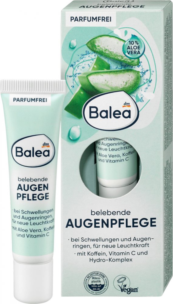 Balea oční krém a jeho osvěžující péče, aloe vera a Hydro komplex intenzivně hydratuje a jemně pečuje o citlivou pokožku kolem očí. Osvěžující oční krém obsahuje komplex s kofeinem a vitamínem C, které redukují otoky a tmavé kruhy pod očima. Aloe Vera zklidňuje podráždění pokožky a vitamín E slouží jako systém ochrany proti UV záření. Zabraňuje tak předčasnému stárnutí pokožky. Dopřejte si důležitou péči a krásnou pokožku.