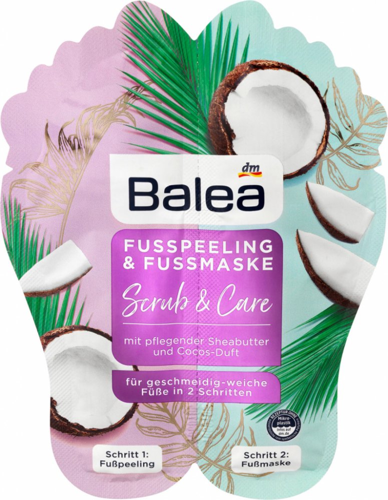 Balea peeling & maska na nohy s bambuckým máslem a kokosovou vůní obsahuje přírodní peelingová zrníčka, která slouží k odstranění odumřelých kožních buněk. Pečující maska s bambuckým máslem a kokosovým olejem zanechá nohy příjemně hebké.# Receptura neobsahuje mikroplasty, ani rozpustné plně syntetické polymery.