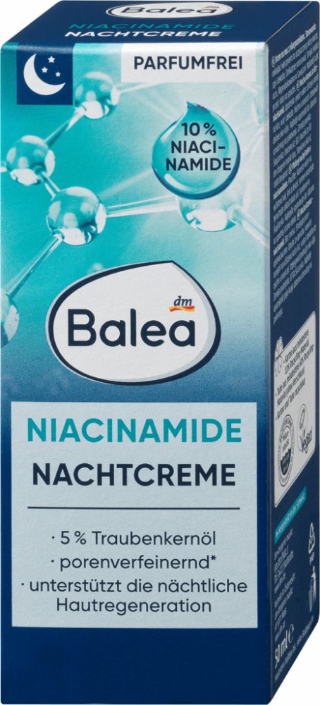 Balea pleťový noční krém s niacinamidem podporuje regeneraci pokožky a jejímu zjemnění. Složení s 5% olejem z hroznových jader podporuje hydrataci a zajišťuje posílení kožní bariéry, stejně jako pružnost. Unikátní pečující složení bez parfemace bylo speciálně vyvinuto pro podporu noční regenerace. Kompatibilita pokožky dermatologicky potvrzena.