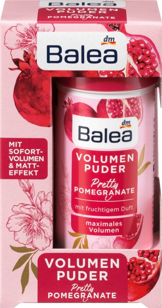 Balea pudr pro objem vlasů Pretty Pomegranate je navržen pro okamžitý objem a matující efekt vašich vlasů. Účesu zajistí maximální objem bez zatížení a okamžitý efekt, který Vám vydrží po celý den. Dopřejte svým vlasům perfektní look s příjemně ovocnou vůní.