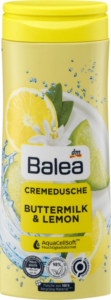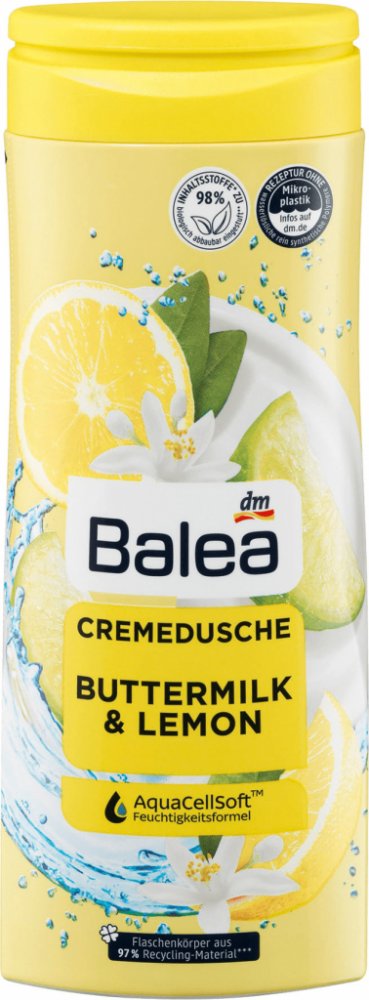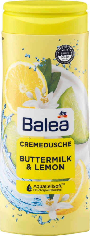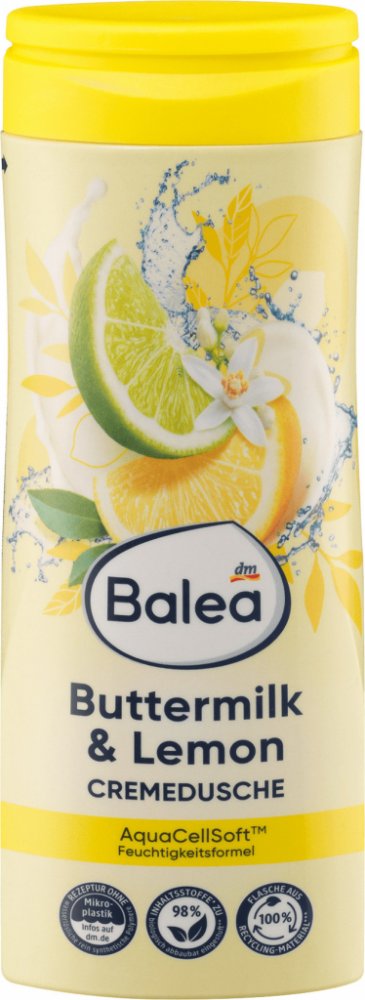 Vhodné pro citlivou pokožku. pH neutrální pro pokožku. Jemné složení s mléčnými proteiny. Ovocně sladká vůně. Dermatologicky schválená snášenlivost s pokožkou. Pro svěží pohodu: Sprchový krém Balea s podmáslím a citronem hýčká tělo i duši. Jemné hydratační složení s AquaCellSoft™ udržuje pokožku jemnou a pružnou. Jemné složení s mlékem chrání pleť před vysušením a udržuje její přirozenou rovnováhu. Vychutnejte si sladkou a ovocnou vůni podmáslí a citronu - svádí smysly! Složení neobsahuje mikroplasty a ve vodě rozpustné, čistě syntetické polymery. Aqua, Sodium Laureth Sulfate, cocoamidopropyl betaine, sodium chloride, Coco-glucoside glycerol, oleate, glycerine, panthenol, hydrogenated starch hydrolysate, BUTYRIS LAC powder, Citrus limon Fruits extract, Opuntia ficus indica STEM extract, hydroxypropyltrimonium resin guar chloride, kyselina citronová, distearát, guma gellan, glycerol-stearát, EDTA disodná, síran hořečnatý, síran sodný, citrát hydrogenovaných palmových glyceridů, tokoferol, parfém limonen, benzoan sodný, fenoxyethanol, kyselina benzoová, CI 13015, CI 47005, CI 19140, CI 14720, CI +28.440-gie dm-drogerie markt GmbH + Co. KG Am dm-Platz 1 76227 Karlsruhe