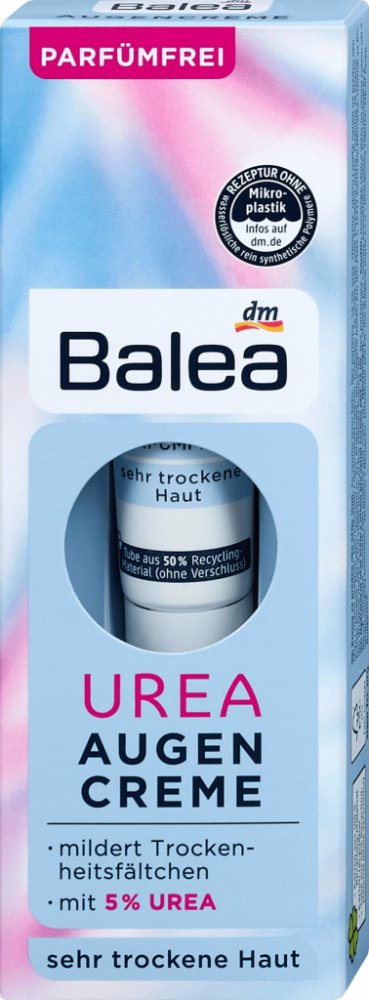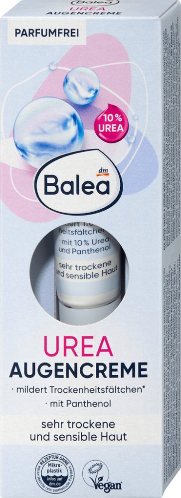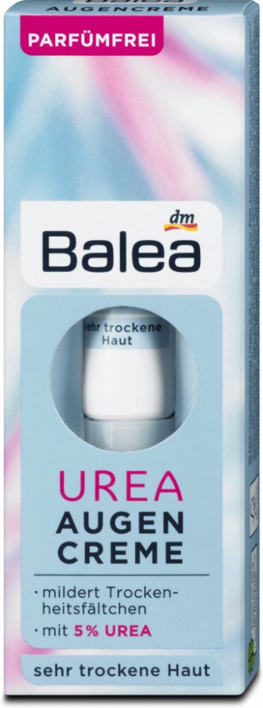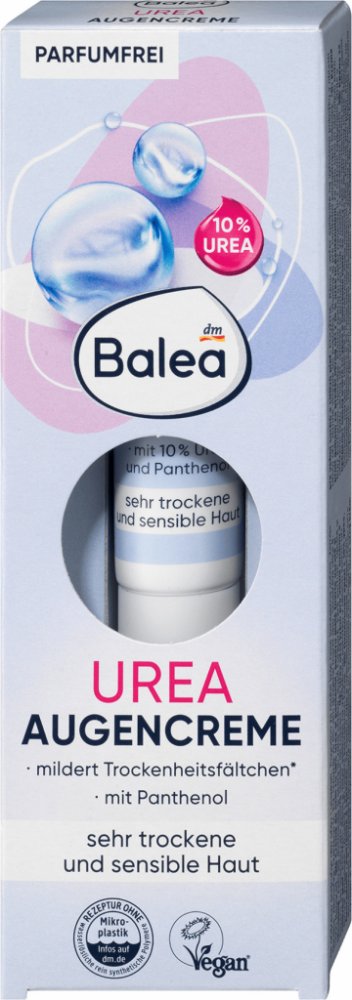 Balea UREA oční krém s obsahem 10% urey dodává očnímu okolí dostatek hydratace. Díky tomu lze redukovat vrásky způsobené suchostí. Díky výživným účinným látkám, jako je 10% urea, avokádový olej, panthenol a skvalan, má oční krém regenerační účinek a pomáhá pokožce lépe absorbovat a ukládat vlhkost. Složení bez parfemace je ideální pro suchou a citlivou pokožku.