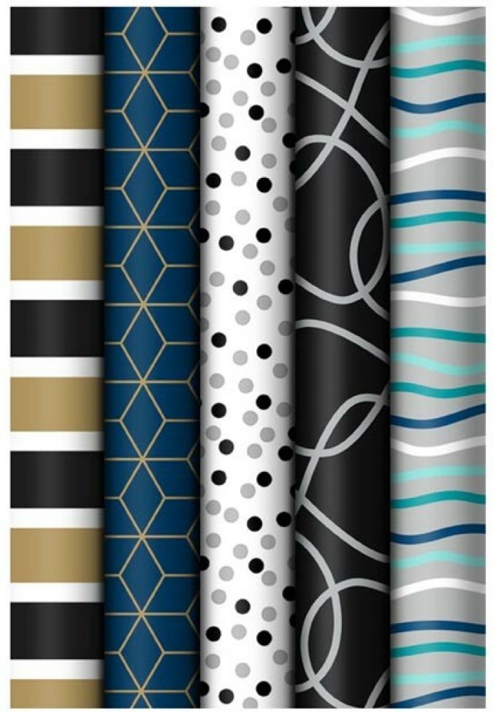 Balicí papír v roli – moderní mix elegance Styl, jednoduchost a nápad – přesně to spojuje tento celoroční balicí papír v roli s originálními geometrickými motivy. Je ideální volbou pro ty, kteří dávají přednost čistému designu a modernímu vzhledu dárků. Černá, šedá, modrá i zlatá vytvářejí elegantní kombinaci barev, která se hodí pro každou příležitost – od narozenin po firemní oslavy. Mix 5 různý...