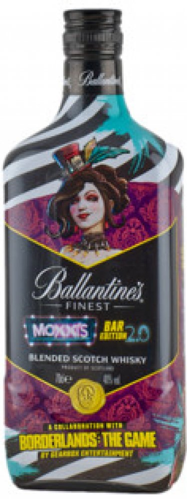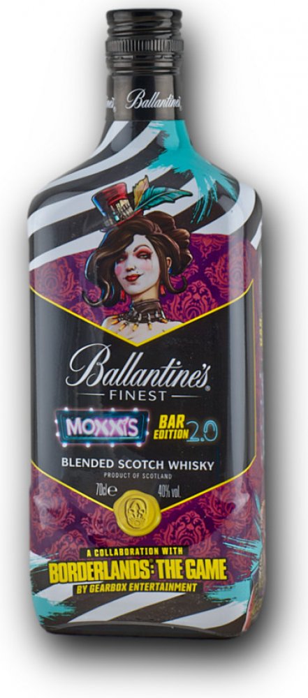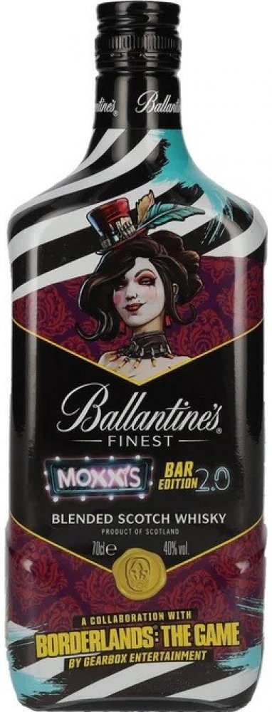Ballantine's FINEST MOXXIS BAR EDITION 2.0 40% 0,7L je limitovaná edice, která vznikla díky spolupráci mezi Ballantine's a populární herní sérií Borderlands. Design láhve, inspirovaný postavou Mad Moxxi, majitelkou baru na planetě Pandora ve hře, přináší tomuto whisky svěží a atraktivní vzhled.