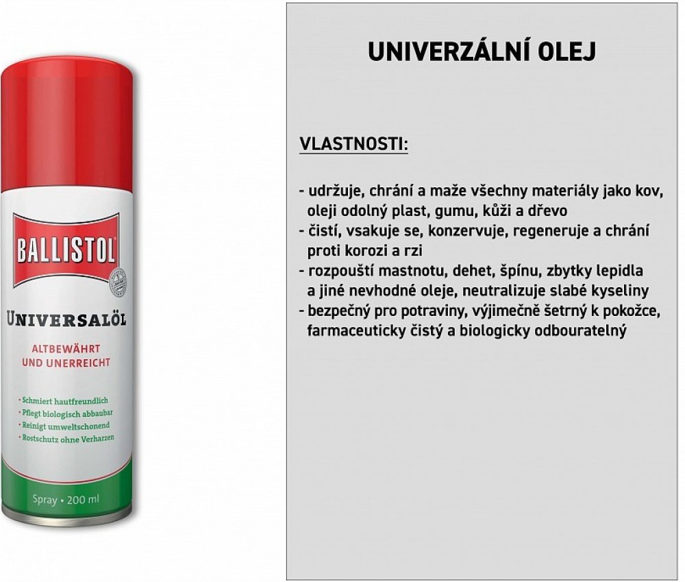 Již více než 115 let je Univerzální olej Ballistol díky svým vlastnostem a všestrannému použití osvědčeným produktem pro průmysl, řemeslná odvětví, domácnost, zemědělství a mnohé další.