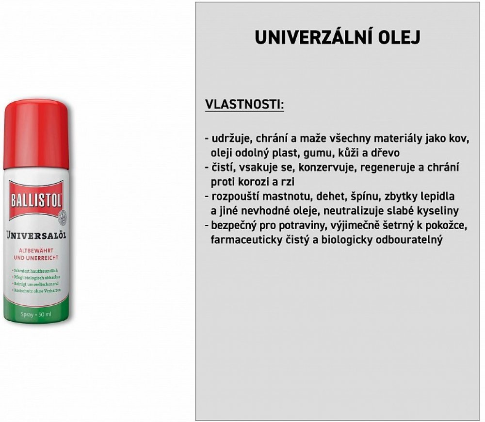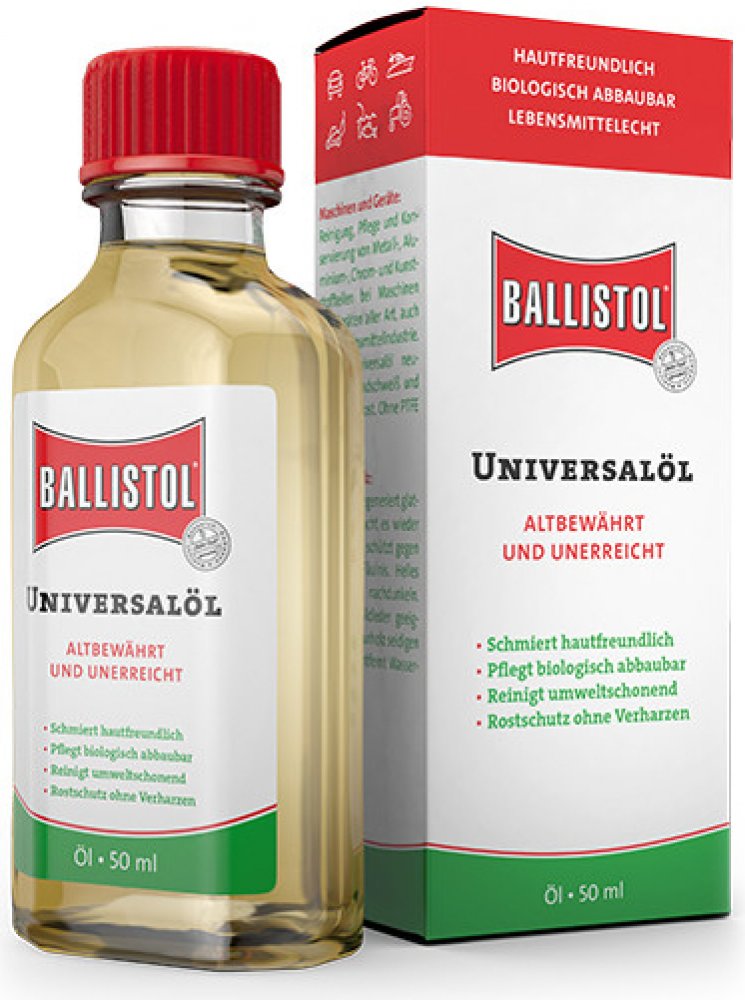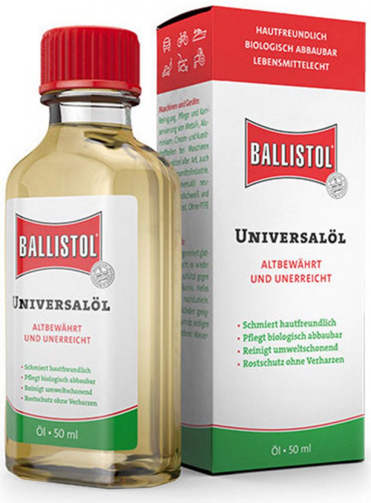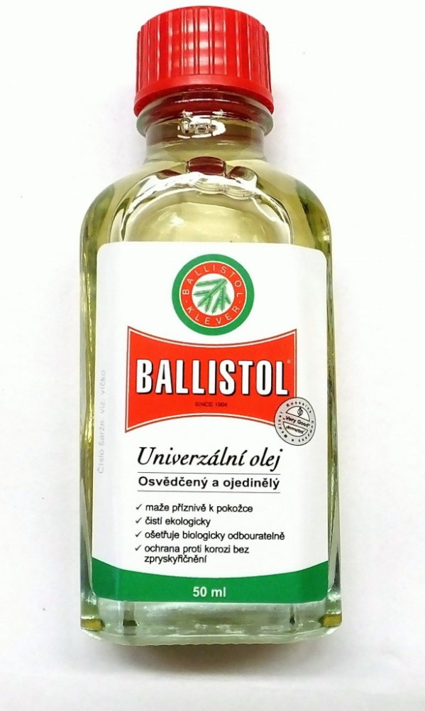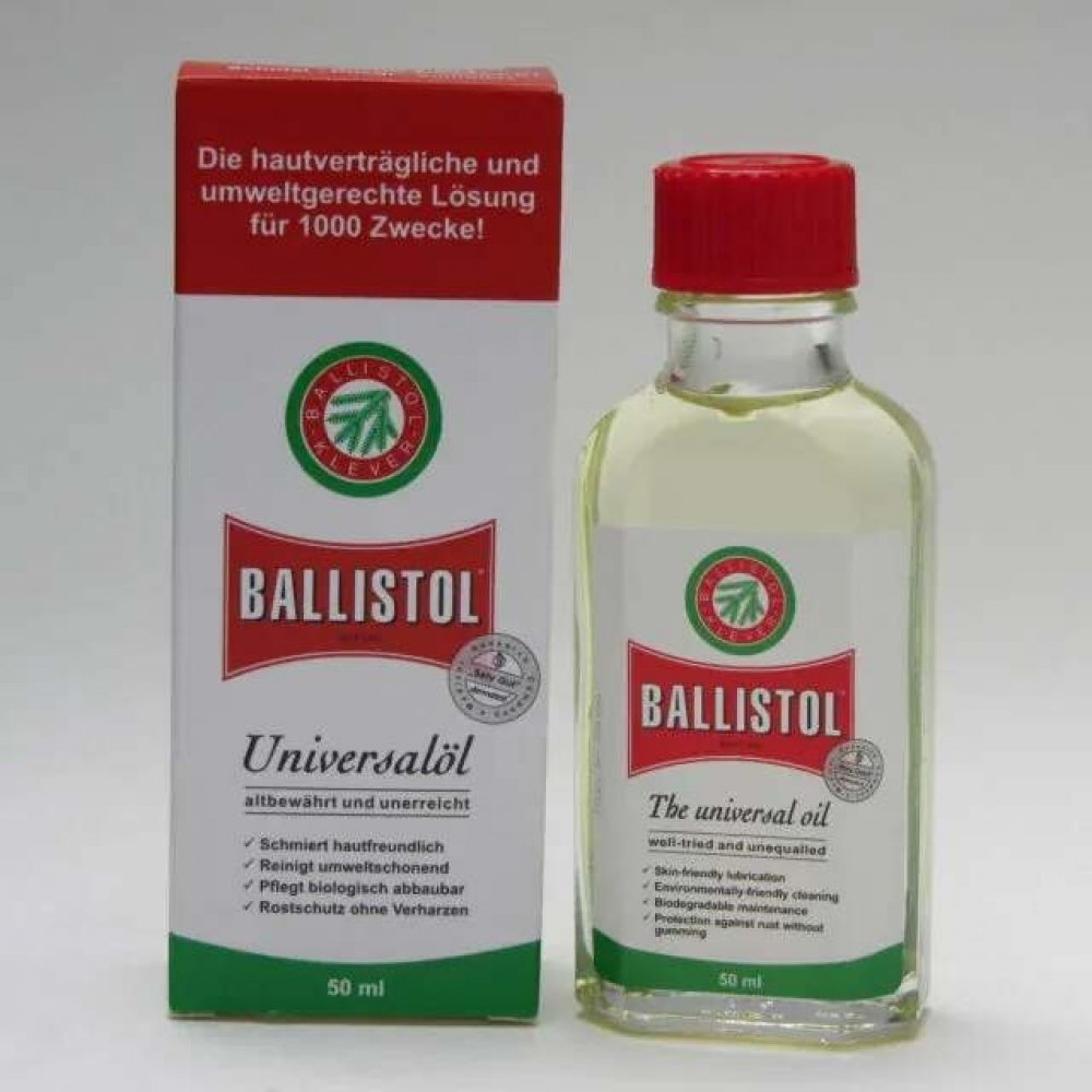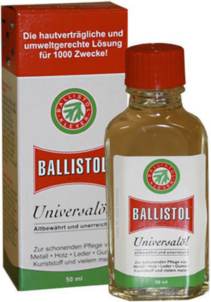 BALLISTOL čistí, ošetřuje, chrání a KONZERVUJE jak lovecké a sportovní zbraně, tak i služební zbraně všeho druhu. Usazeniny olova, mědi a červené mosazi v hlavni se chemicky rozpustí a zbraň opět získá původní přesnost. BALLISTOL neutralizuje usazeniny kyselých zplodin a zneškodní je. Ideální k péči, regeneraci, impregnování dřevěných pažeb, řemenů a kožených pouzder.