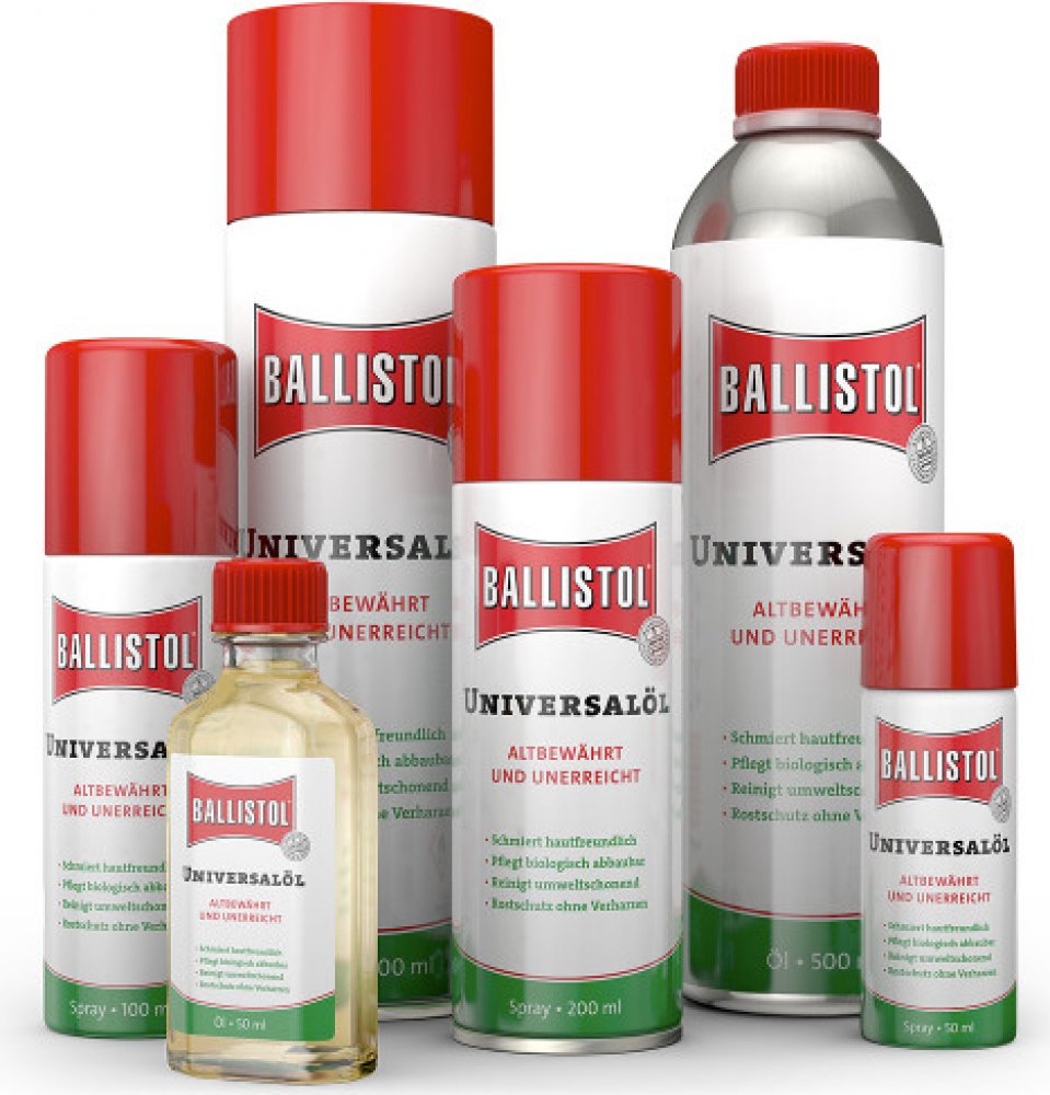 Účinné složky v BALLISTOLU jsou přirozeného původu, popř. se vyskytují v přírodě. Jeho základním olejem je lékařsky čistý bílý olej. BALLISTOL neobsahuje žádné pryskyřice a kyseliny a je odolný proti stárnutí. Jako sprej přirozeně bez FCKW. Všechny složky BALLISTOLU jsou biologicky odbouratelné a pro naše okolí neškodné.