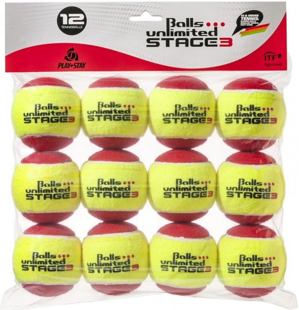 Juniorské tenisové míčky Balls Unlimited Stage 3 12B Juniorské míčky se sníženou kompresí, o 6 % větší a 20 % lehčí než standardní míčky. Díky vyššímu odporu vzduchu umožňují mladým hráčům zdokonalovat techniku pro první delší údery, poskytují více času na reakci. Mají certifikát ITF.