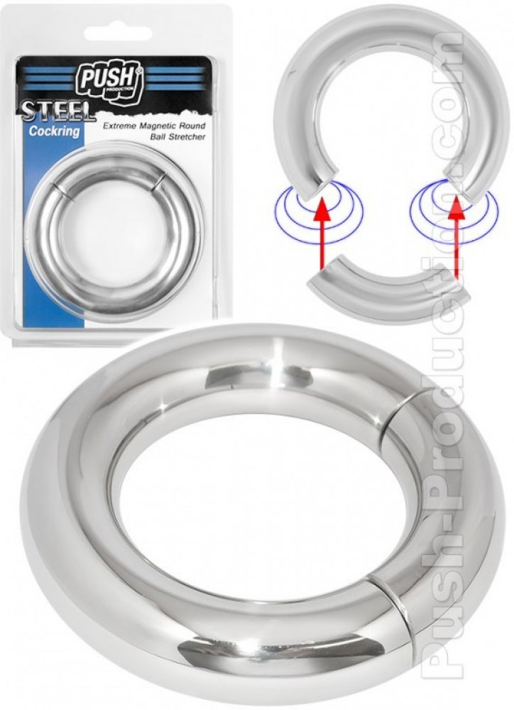 Kulatý natahovač varlat s magnetickým uzávěrem. Velmi snadné použití: Stačí odstranit magnetickou část, vložit a znovu vyměnit část. Silné magnety drží kroužek pevně pohromadě.