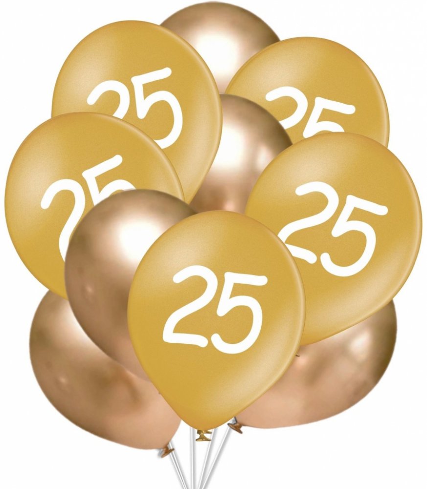 Balónky 25 narozeniny zlaté 10 ks 30 cm mix V balení je 5 x ks balónků zlatých metalických s potiskem čísla (b80111) a 5 x ks balónků zlatých chromových. Doveďte svou slavnostní výzdobu k dokonalosti s chromovými balónky ve zlatém odstínu. Průměr balónku v nafouknutém stavu je 30 cm, výška 38 cm a obvod 85-90 cm. Objem balónku je 15 L. Chromové balónky ve zlatém odstínu jsou elegantní dekorací pro jakoukoliv příležitost. Můžete je nafukovat heliem anebo vzduchem. Doba létání latexových balonků nafouknutých heliem je 8-12 hodin – v závislosti na objemu balónků a okolní teplotě. Delší dobu létání mají foliové balónky – několik dní. Dobu létání latexových balónků je možné prodloužit gelem HI FLOAT.