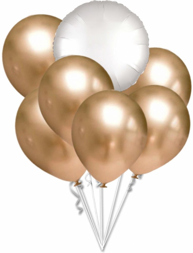 Balónky chromové zlaté a bílý balónek kruh set V balení je 6 x ks chromových zlatých balónků průměr 30 cm a fóliový balónek bílý kruh 42 cm. Objem chromového balónku je 15 L a fóliového balónku je 11 L. Chromové balónky ve zlatém odstínu jsou elegantní dekorací pro jakoukoliv příležitost. Můžete je nafukovat heliem anebo vzduchem. Doba létání latexových balonků nafouknutých heliem je 8-12 hodin – v závislosti na objemu balónků a okolní teplotě. Delší dobu létání mají foliové balónky – několik dní. Dobu létání latexových balónků je možné prodloužit gelem HI FLOAT.