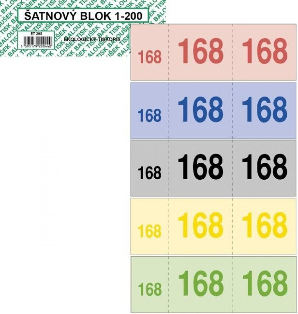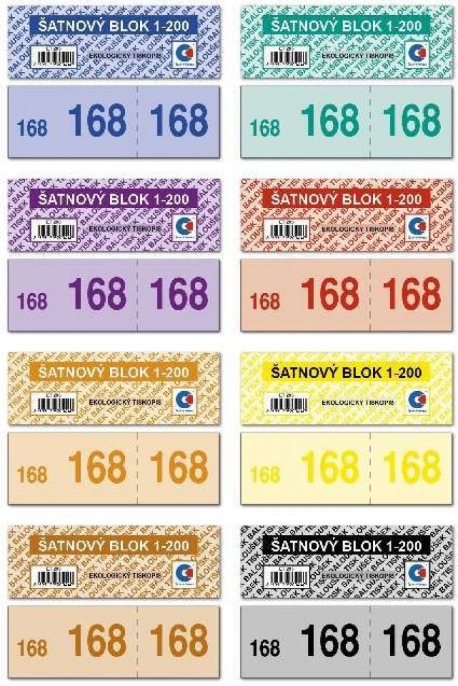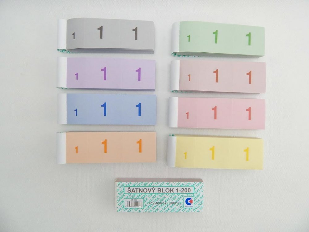Šatnové bloky z recyklovaného hlazeného papíru. Dodáváme v 8 barevných provedeních v závislosti na nabídce výrobce. Formát 135 x 47 mm, 200 lístků v bločku.