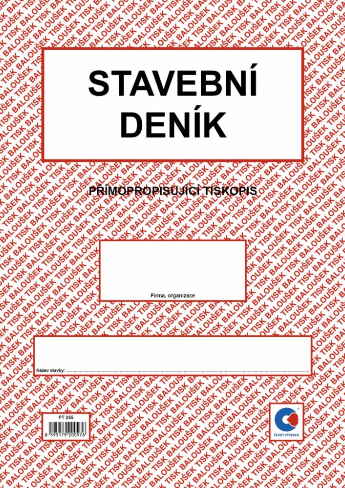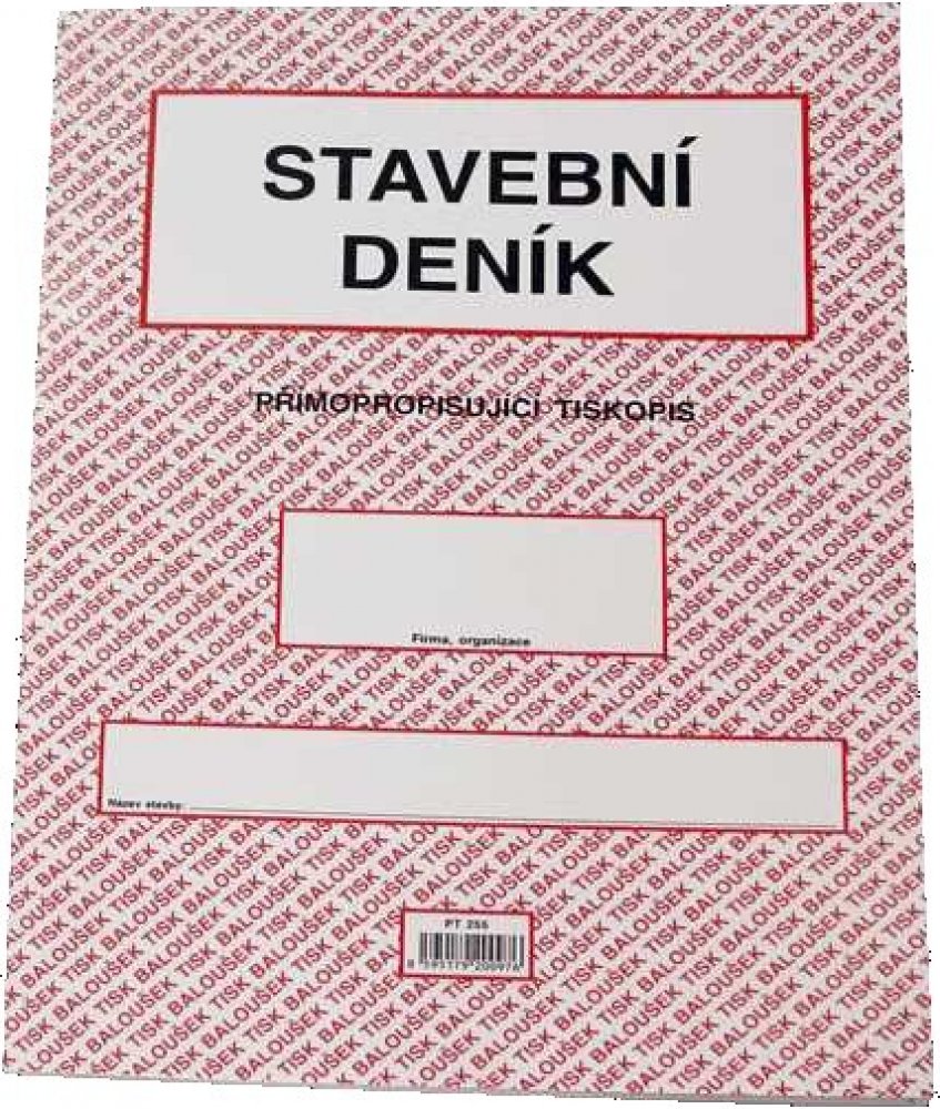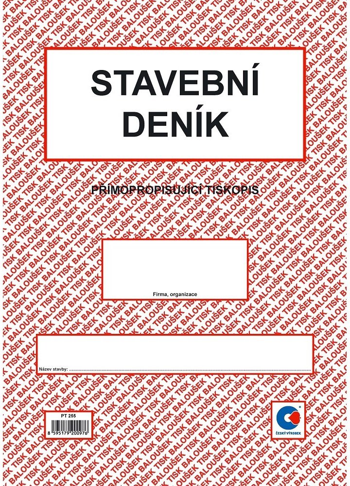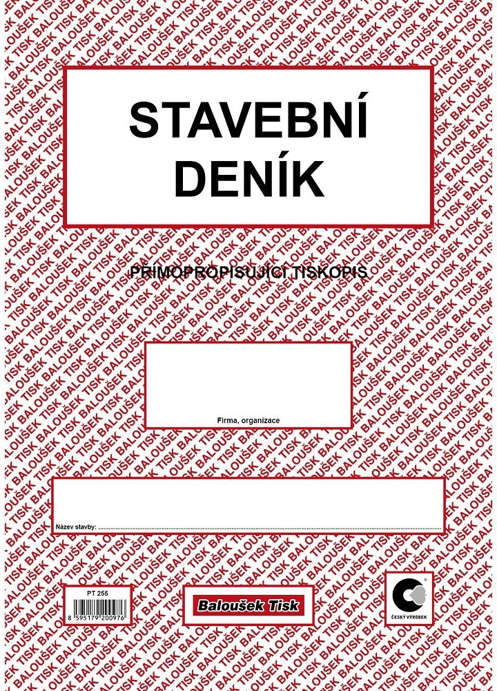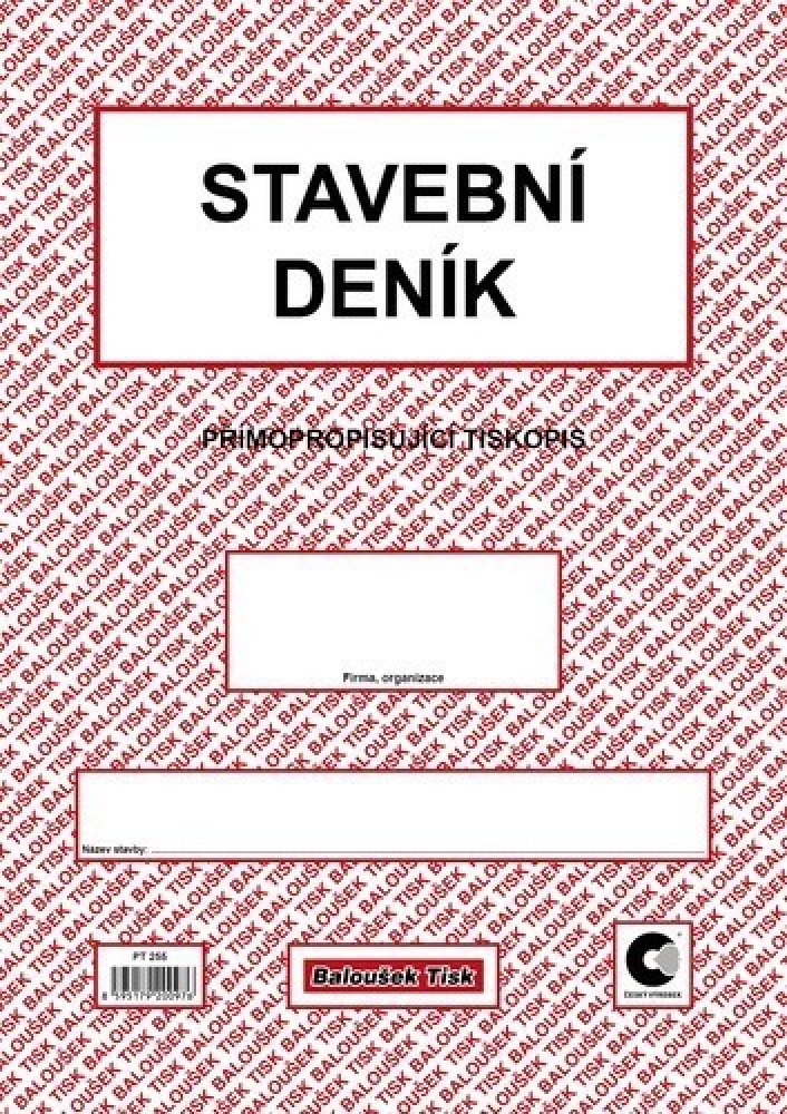 Stavební deník A4 propisující PT 255. Přímopropisující tiskopis, formát A4. Identifikační údaje stavby podle projektové dokumentace. Přehled smluv, jejich změn a doplňků. Lhůtník. Seznam úředních opatření týkajících se stavby. Seznam všech dokladů týkajících se stavby (např. seznam protokolů o předání, vytyčení a uvolnění staveniště, o předání objektu apod.). Přehled zkoušek všech druhů. Přehled objednávek poddodavatelů a průběh plnění. Seznam technické dokumentace stavby, jejich změn a doplňků. Denní záznamy stavby (1 + 2 kopie).