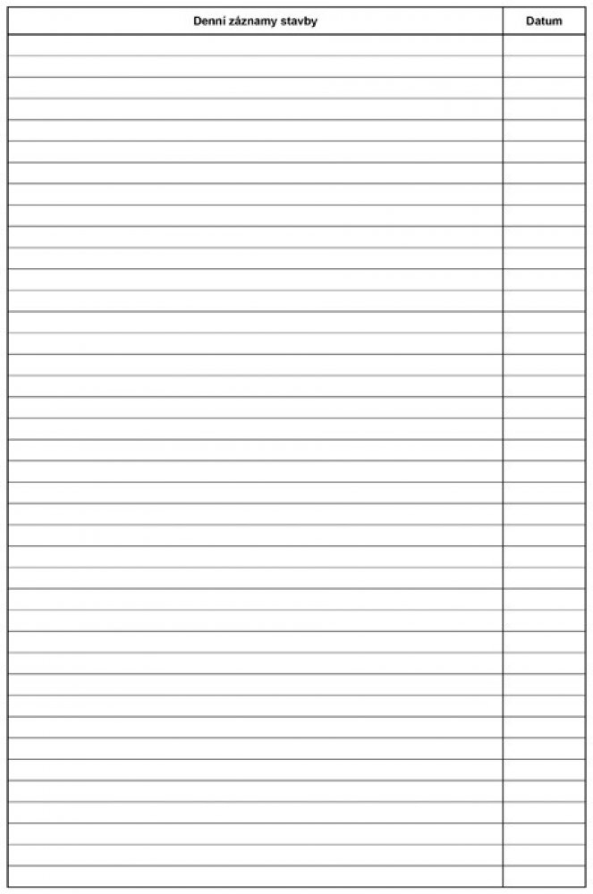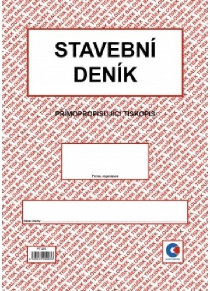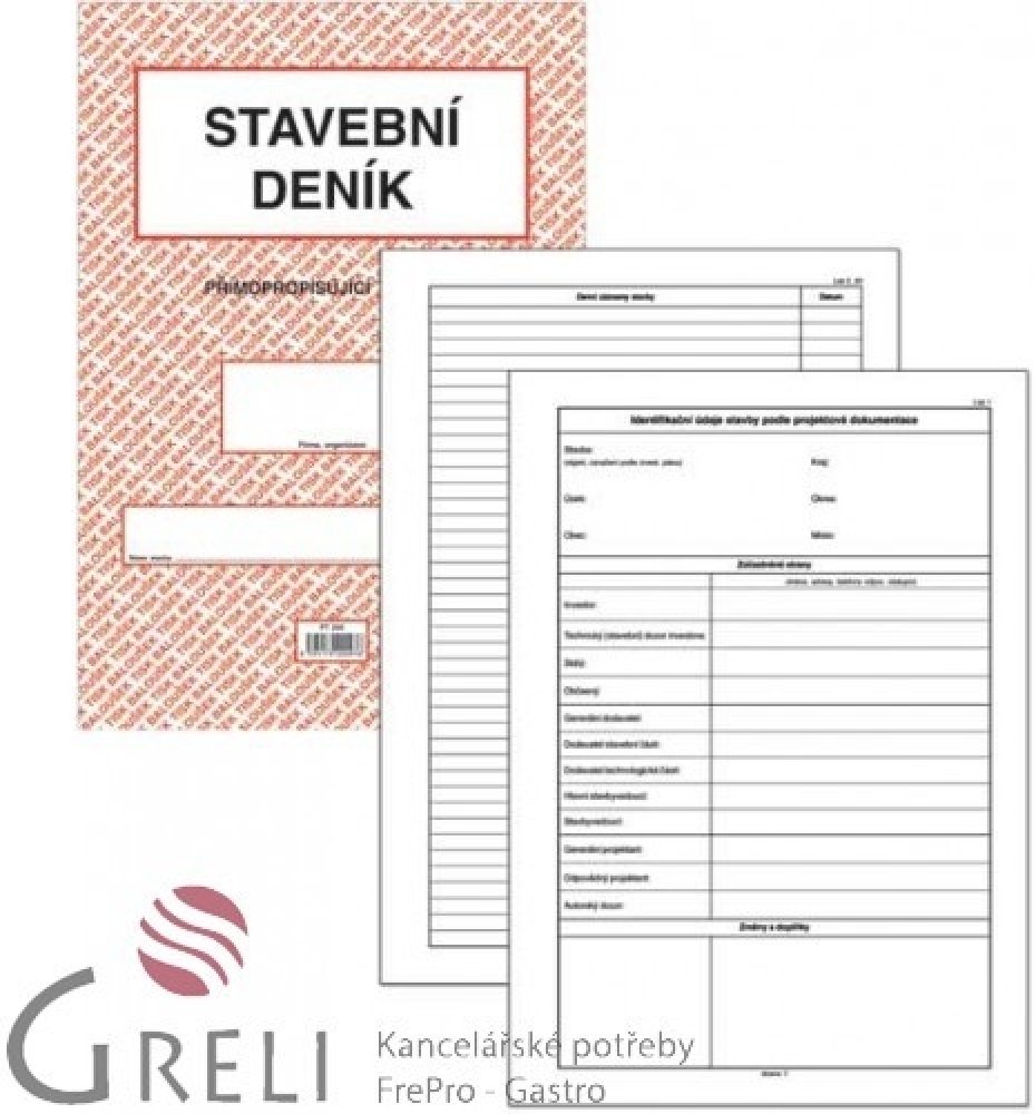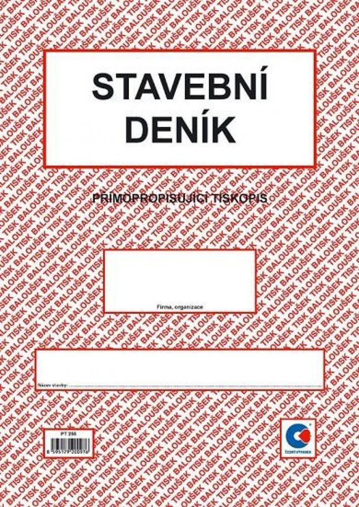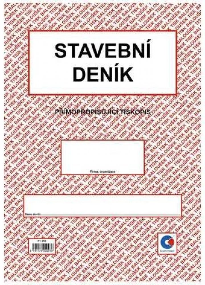 Stavební deník A4 propisující PT 255. Přímopropisující tiskopis, formát A4. Identifikační údaje stavby podle projektové dokumentace. Přehled smluv, jejich změn a doplňků. Lhůtník. Seznam úředních opatření týkajících se stavby. Seznam všech dokladů týkajících se stavby (např. seznam protokolů o předání, vytyčení a uvolnění staveniště, o předání objektu apod.). Přehled zkoušek všech druhů. Přehled objednávek poddodavatelů a průběh plnění. Seznam technické dokumentace stavby, jejich změn a doplňků. Denní záznamy stavby (1 + 2 kopie).