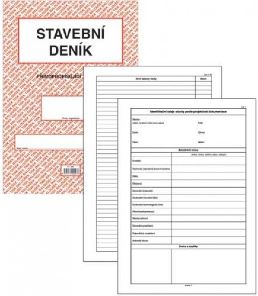 Stavební deník A4 propisující PT 255. Přímopropisující tiskopis, formát A4. Identifikační údaje stavby podle projektové dokumentace. Přehled smluv, jejich změn a doplňků. Lhůtník. Seznam úředních opatření týkajících se stavby. Seznam všech dokladů týkajících se stavby (např. seznam protokolů o předání, vytyčení a uvolnění staveniště, o předání objektu apod.). Přehled zkoušek všech druhů. Přehled o...