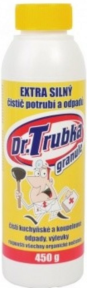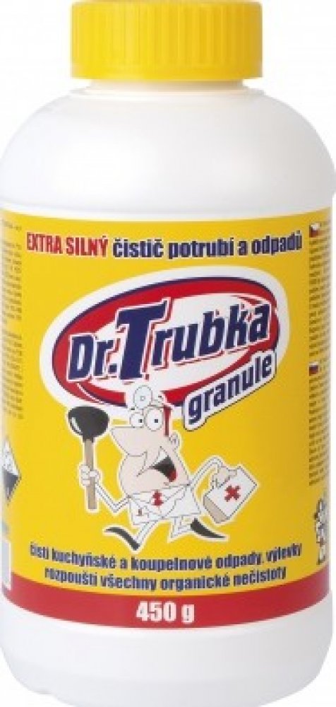 Dr. Trubka je velmi silný čistič potrubí a odpadů pro každou domácnost a díky své síle také pro průmyslové použití. Svou silou zajistí dokonalé pročištění a průchodnost každého zaneseného odpadu a potrubí. Doporučená prevence:Udržení průchodnosti všech vašich odpadů v domácnosti - 1× za 14 dní nasypte cca. 50 g čističe odpadů do každého odpadu a zalijte 1/4 l horké vody. Správné čištění odpadů a potrubí: 1) připravte si cca. 1/2 teplé vody. Dávkování se řídí velikostí a průchodností čištěného odpadu. 2) Do sifonu umyvadla, vany, sprchového koutu nalijte 1/4 l horké vody a následně nasypte cca. 100 g Dr. Vrtka - čističe odpadů. Používejte k čištění vždy jen doporučené množství. 3) Čistič nechte cca. 5 minut působit a poté zalijte zbylou teplou vodou cca. 1/2 l. 4) Po dalších 3 minutách můžeme propláchnout tekoucí vodou a čištění je hotové. Při větších nečistotách celý proces opakujeme. Upozornění:Při zalívání teplou vodou dochází k prudké reakci, která je důležitá pro dobré vyčišštění a potlačení zápachu Vašeho odpadu. Je třeba při zalívání mít obličej a ruce mimo dosah případného potřísnění. Doporučujeme použití gumových rukavic a obličejového štítu nebo brýlí! Bezpečnost práce:Dr. Trubka obsahuje hydroxid sodný, který může poškodit zdraví při styku s pokožkou, zasažení očí nebo náhodném požití.