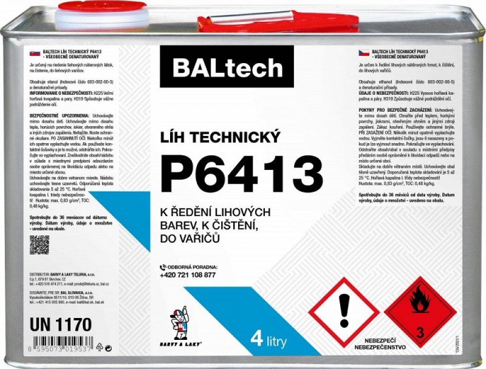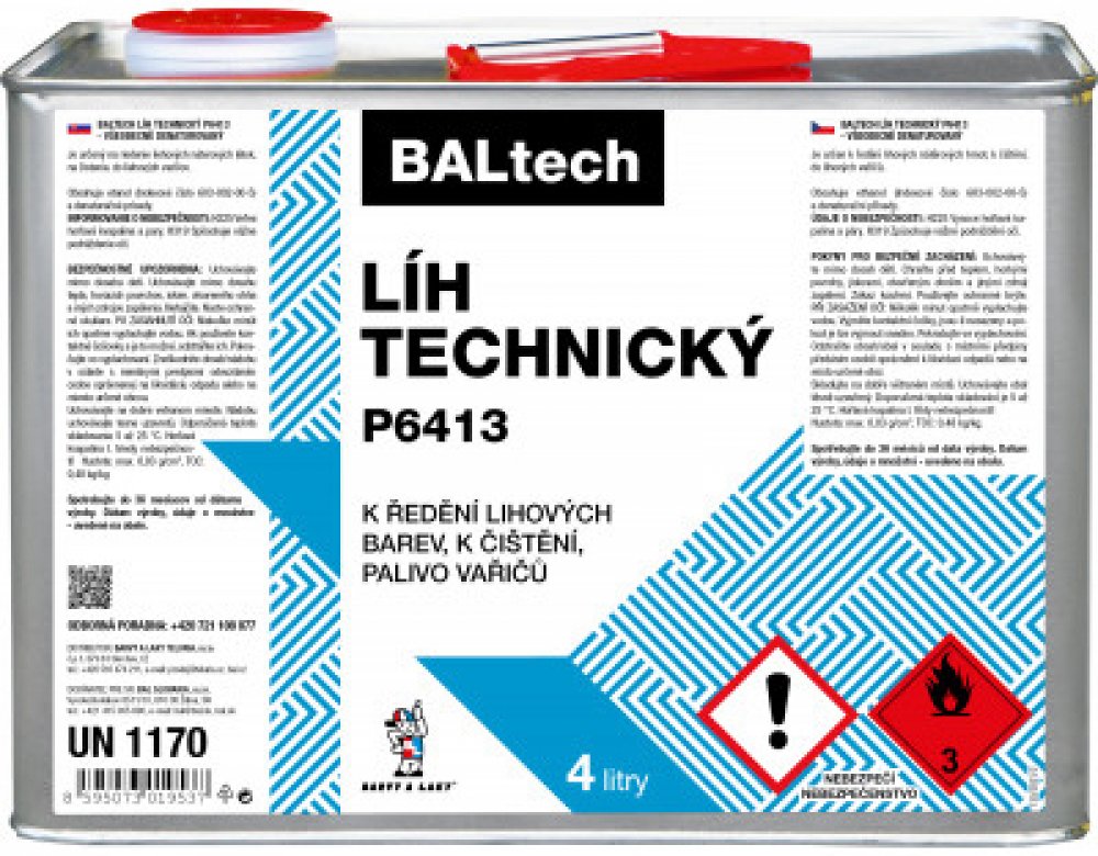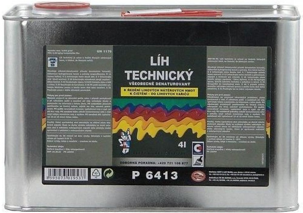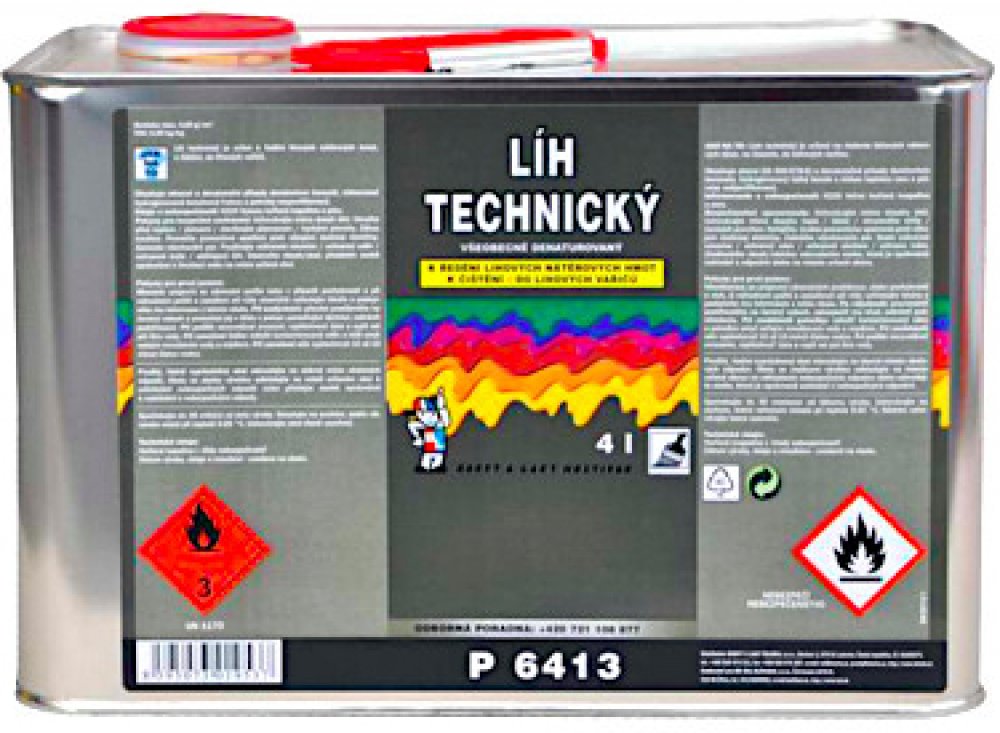 Denaturovaný etanol. Líh technický je určen k ředění lihových nátěrových hmot, k čištění, do lihových vařičů.