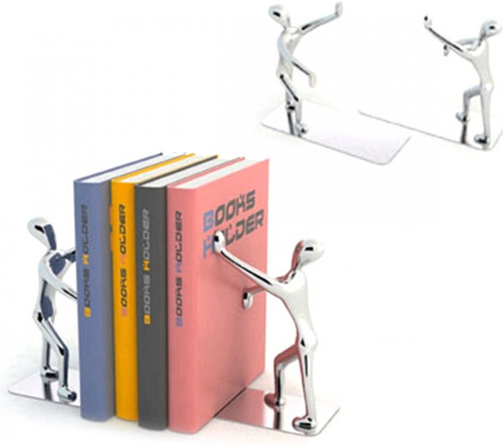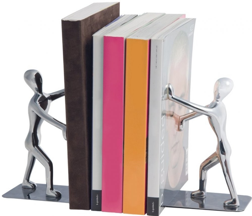 Plochá základna zarážek se zasouvá pod koncové knihy. Zarážky jsou vyrobeny z chromovaného kovu.