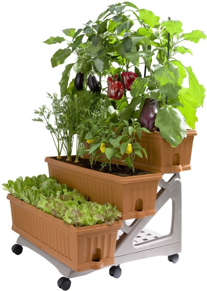 Zeleninová zahrádka na balkoně Jistě, se sadou ORTO 3 květináče o délce 80 cm, z nichž jediný se rozvíjí na třech stupních, aby byly všechny rostliny lépe vystaveny slunci a vyvýšeny nad podlahu pro lepší funkčnost.