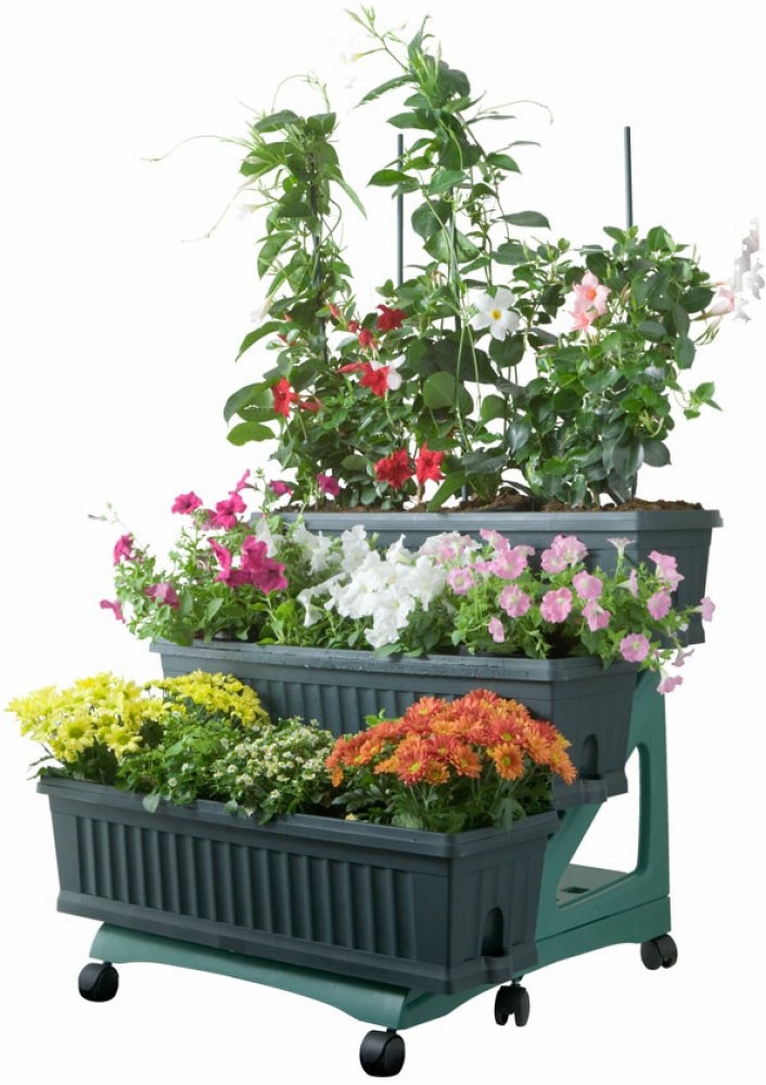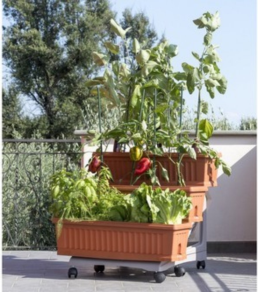 Sada ORTO má konstrukci vybavenou kolečky, která umožňuje snadný přesun a poskytuje všem rostlinám správnou expozici vůči slunci, a uvnitř 3 květináčů má sedátka pro umístění podpěr pro popínavé rostliny.