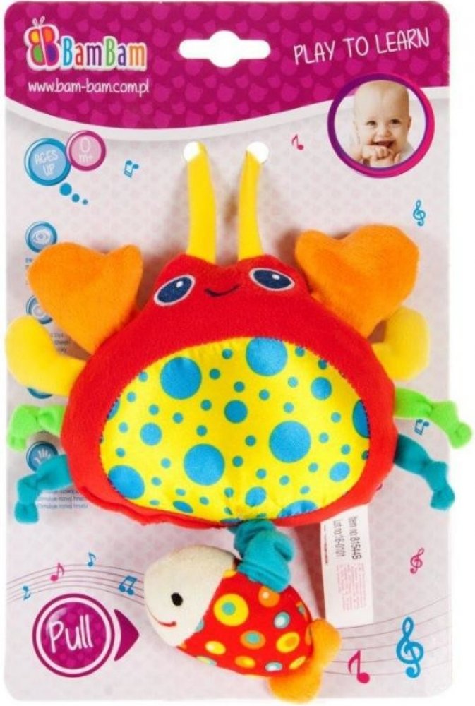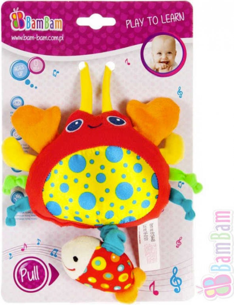 Pestrobarevný krabík z plyše pro nejmenší děti, který hraje po natažení příjemnou melodii.