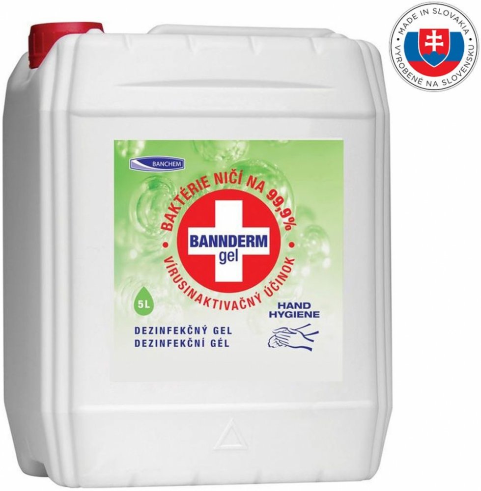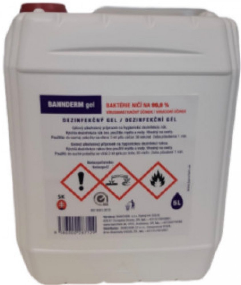 Gel na dezinfekci rukou BANNderm - 5 lGelový, alkoholový přípravek na hygienickou dezinfekci rukou. Bakterie ničí na 99,9%. Moderní způsob ochrany zaměstnanců před hygienickými riziky. Vynikající řešení zejména v případech nižší dostupnosti vody. Vhodný i do potravinářského průmyslu a hygienicky zatížených provozů.Spektrum účinnosti: baktericidní, fungicidní, virucidní (A, V, B)Účinná látka:Propan-2-ol 45gPropan-1-ol 30 g, 2-fenylfenol 0,45gKvartérní amoniové sloučeninyC 12-16-alkyl (benzyl) dimetylamónium-chloridy 0,25gPoužívejte biocidy bezpečným způsobem. Před použitím si vždy přečtěte etiketu a informace o přípravku na etiketě!Návod k použití: Do suché pokožky se vtírají 3 ml gelu během 30 sekund. Doba působení 1 min.Produkty BANCHEM si našly své uplatnění v průmyslu, hotelnictví, státní správě a v ZDRAVOTNICTVÍ.Vyrobeno na SlovenskuNejzávažnější nepříznivé fyzikálně-chemické účinky na lidské zdraví a na životní prostředí:Vysoce hořlavá kapalina.Způsobuje vážné poškození očí.Může způsobit ospalost nebo závratě.Výstražné slovo: Nebezpečí !Bezpečnostní upozornění:Uchovávejte mimo dosah dětí.Uchovávejte mimo dosah tepla, jisker, horkých povrchů, otevřeného ohně.Zabraňte vdechování par.Noste ochranné brýle.Po zasažení očí několik minut vyplachujte vodou.Nevhodná hasiva: silný vodní proud