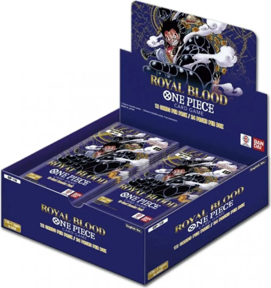 One Piece TCG Royal Blood - OP-10 - Booster Box - anglický box s 24 boostery. V každém balíčku je 12 náhodně namíchaných karet edice Royal Blood. Rozšiřte svoji sbírku nebo herní balíček o anglické karty ze série One Piece Royal Blood.