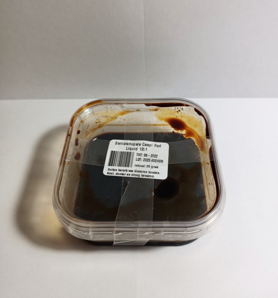 Extrakt 12:1 z rostliny Banisteriopsis caapi Red, v plastové lahvičce, konzistenci má jako hustý sirup.