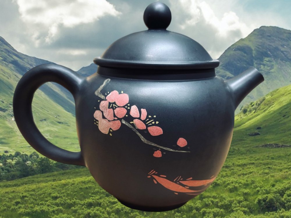 Kvalitní a ručně vyráběná Jianshui konvička s malovaným motivem. Čajová konvička je vyrobena z fialové Jianshui hlíny (Jianshui Zitao 建水紫陶) a pochází z malé hrnčířské dílny ve městě Jianshui (建水) z jihovýchodní čínské provincie Yunnan. Konvička byla vyrobena technikou (Yinkeyangtian 印刻阳填), při níž se požadovaný motiv nejdříve vyryje a následně vyplní hlínou před výpalem. Konvička je vybavena vnitřním keramickým sítkem ve tvaru bubliny. Historie této keramiky sahá až 3500 let a je jednou ze čtyř nejslavnějších typů čínské čajové keramiky.