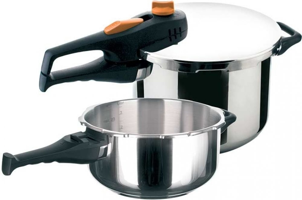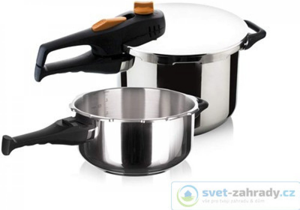 Sada nerezových tlakových hrnců o objemu 3,5 l a 6 l. Hrnce mají silné sendvičové dno, které šetří čas a energii, bajonetový uzávěr a bezpečnostní ventil.