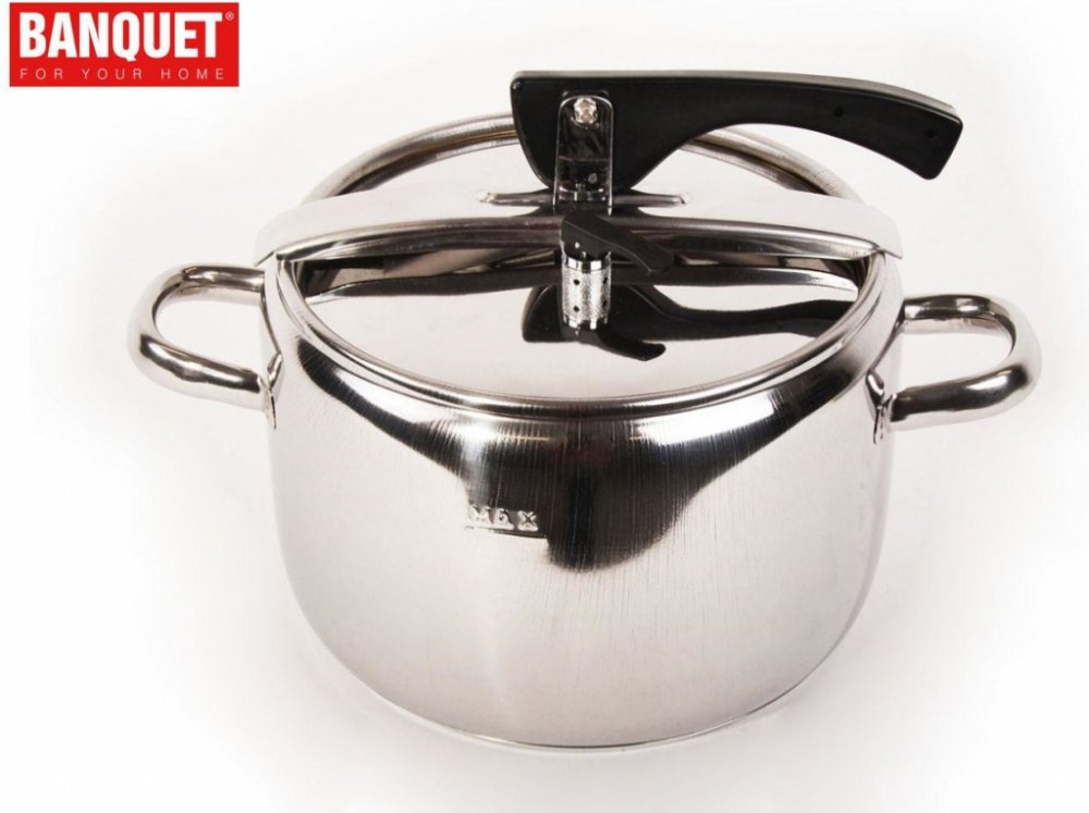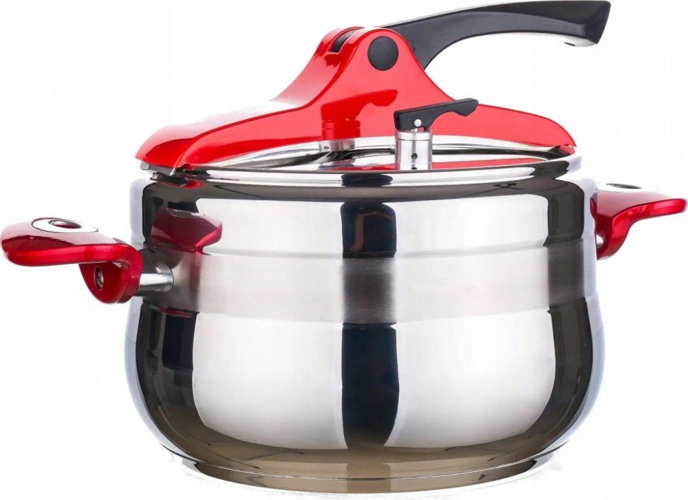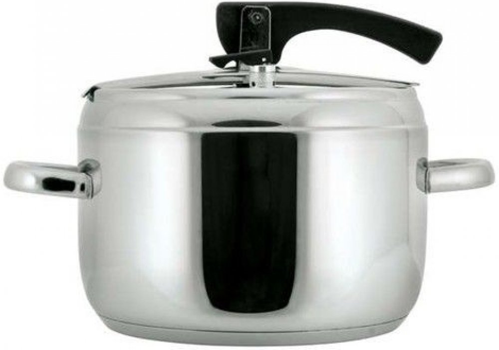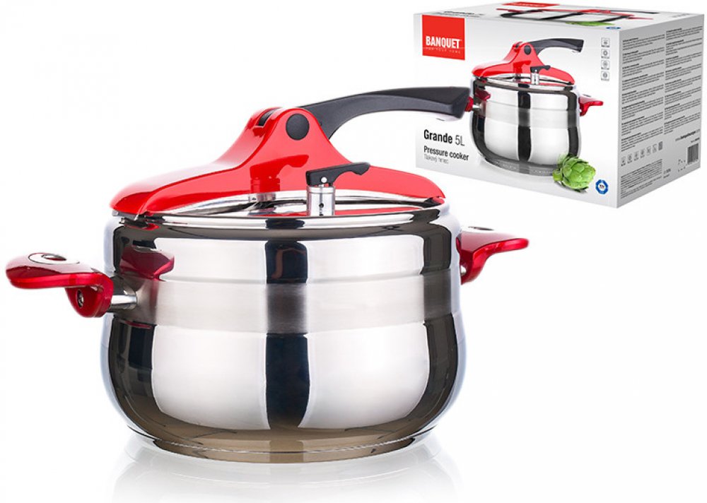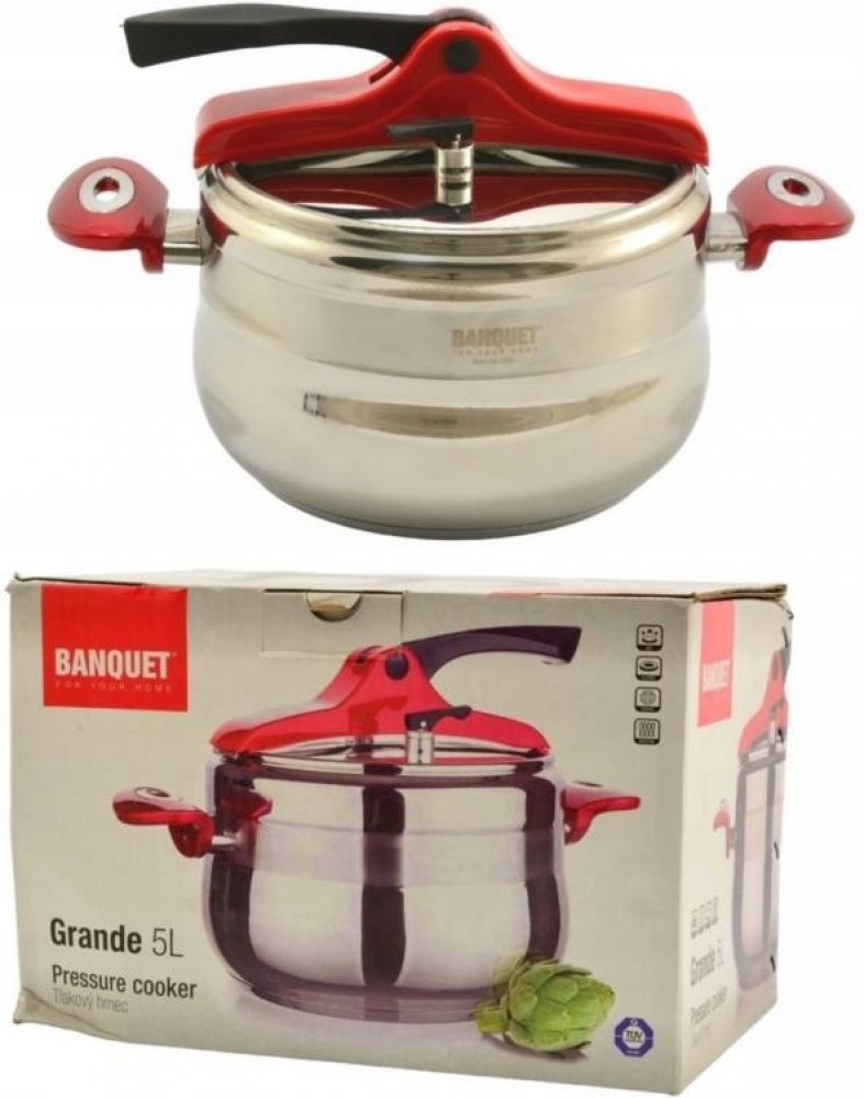 Nerezový tlakový hrnec o objemu 5 l. Víko obsahuje hlavní pracovní a pomocný ventil, což činí hrnec max. bezpečný. Sendvičové dno pro dokonalý rozvod tepla.
