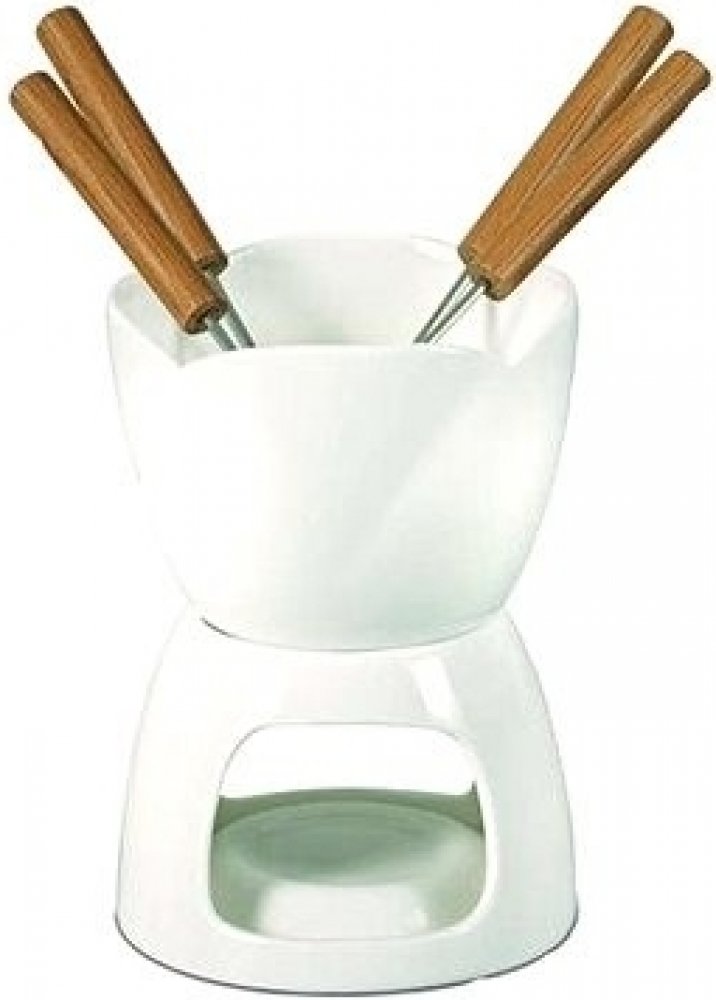 6dílná sada Fondue COLLEZIONE BIANCA. Sada obsahuje: 1x keramickou misku o průměru 10.5 cm a výšce 8 cm, 1x keramický stojánek na svíčku (průměr 10.5 cm, výška 7.5 cm), 4x nerezovou vidličku délky 17.5 …