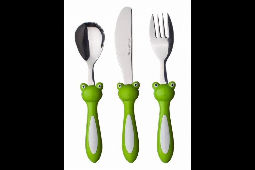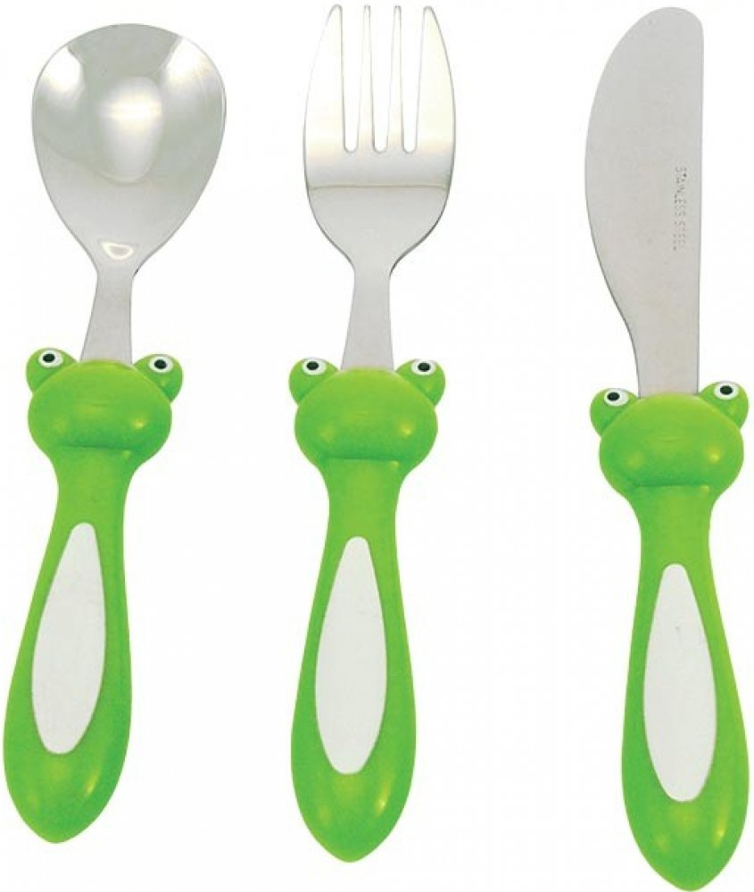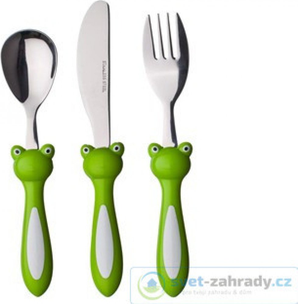 3dílná sada dětských příborů FROG s plastovou rukojetí v designu žáby. Sada obsahuje jídelní lžíci 15,5 cm, jídelní nůž 17,5 cm, jídelní vidličku 16,3 cm.