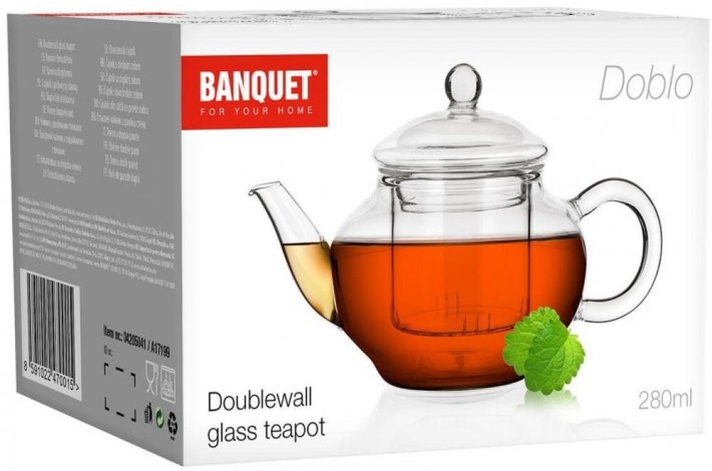 Chcete si vychutnávat čaj ve větším množství? Čajová konvice Banquet se rozhodně během stolování neztratí. Materiálem jejího těla je Sklo. Konvice o objemu 0,28 l bude skvělým pomocníkem při přípravě čajů a dalších teplých nápojů. Čajová konvice vydrží mytí v myčce, díky tomu můžete dát ručnímu mytí sbohem. Základní parametry čajové konvice BANQUET DOBLO 280 ml Konvice skleněná dvoustěnná Ideální pro rychlou přípravu teplých i studených nápojů Čajovou konvici lze vložit do myčky Materiál čajové konvice Banquet: sklo Objem konvice: 0,28 l