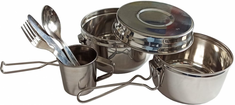 Kempingová sada nádobí velká - je 7-mi dílná sada nerezového nádobí. Základní ešus o objemu 1,4 litru (průměr 15 cm), 1 x malý ešus o objemu 1 litr (průměr 13 cm), univerzální poklička - víčko na vaření 15 cm, dále sada obsahuje hrnek průměru 7 cm - 170 ml objem a příbory - lžíce, nůž a vidlička. Vše je vyrobené z nerezové oceli Vzhledem ke své nízké hmotnosti a skladnosti je to ideální volba pro ...