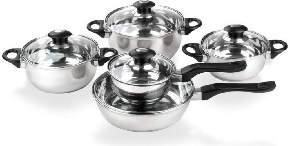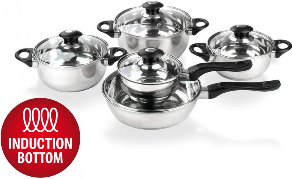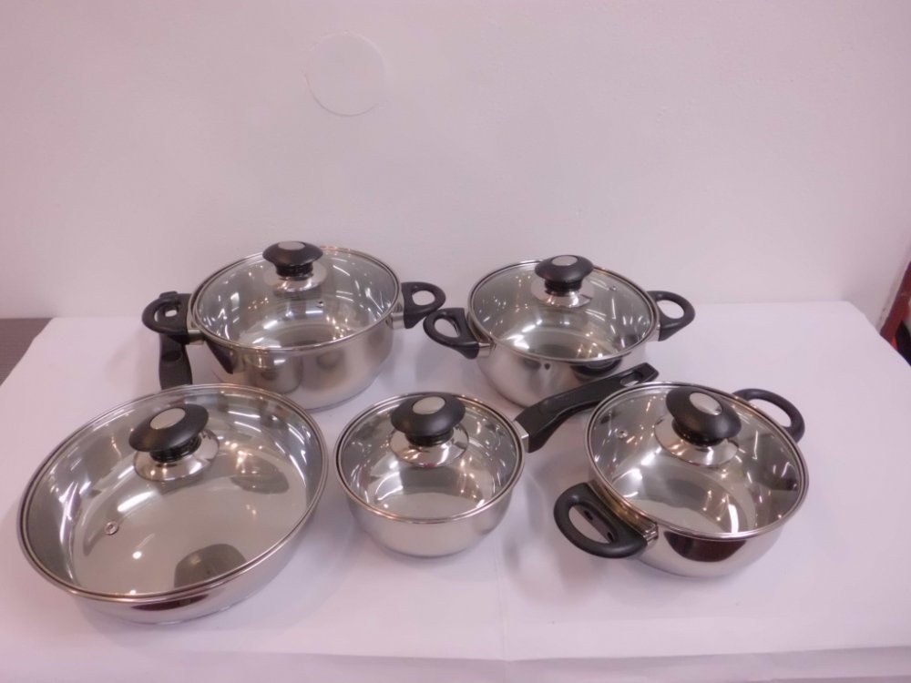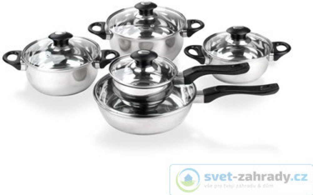 Sada nerezového nádobí se skleněnými poklicemi a bakelitovými úchyty. Vhodná pro všechny typy tepelných zdrojů včetně indukce.