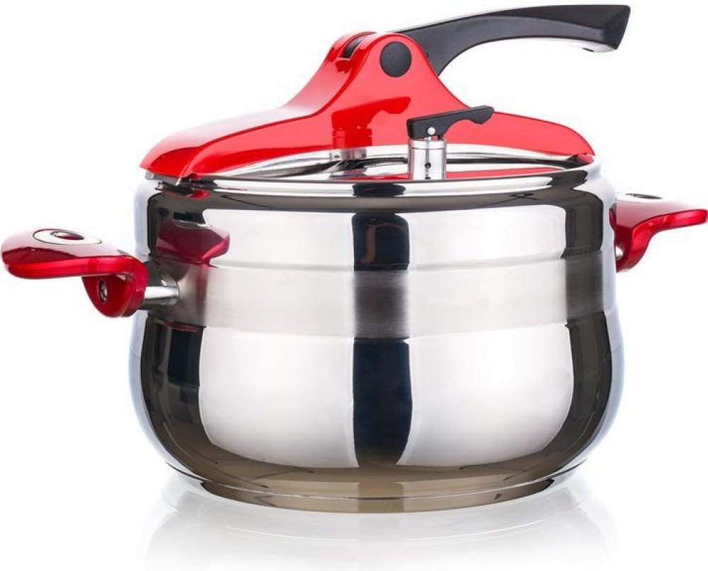 Originální zpracování trendový tvar kvalitní sendvičové dno dva ventily Tlakový nerezový hrnec GRANDE Red v originálním zpracování má pákový uzávěr a trendový baňatý tvar. Hrnec je vhodný na všechny typy varných desek včetně indukce. Víko tlakového hrnce obsahuje hlavní pracovní ventil a pomocný ventil pro případ zanešení hlavního. Hrnec má kvalitní sendvičové dno o tloušťce 1 cm a síla stěny je 0...