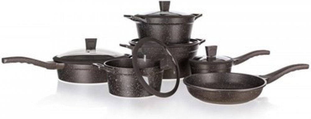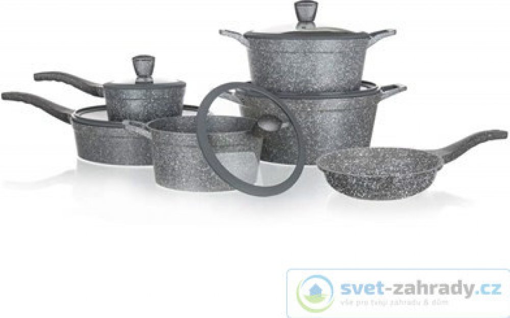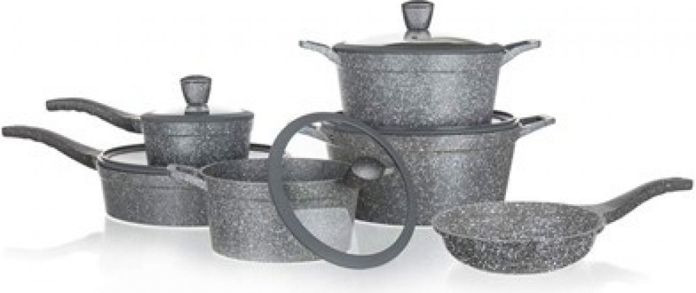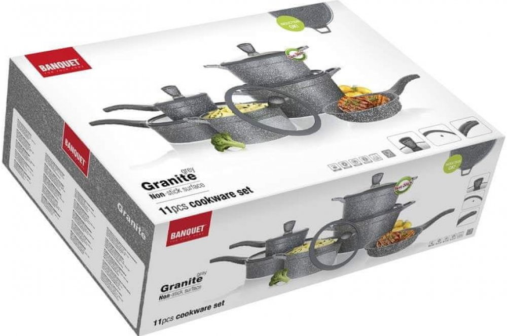 Trávíte u sporáku mnoho času a je to na vašich hrncích a pánvičkách znát? Pořiďte si jedinečnou sadu nádobí Granite Grey od Banquetu. Díky praktickým rukojetím nádobí můžete připravovat pokrmy i v troubě. Jednotlivé pánve a kastroly zapadají do sebe. Ušetříte spoustu úložného místa v kuchyni. Indukční dno u nádobí zvýší efektivitu přípravy a rychlost vaření.