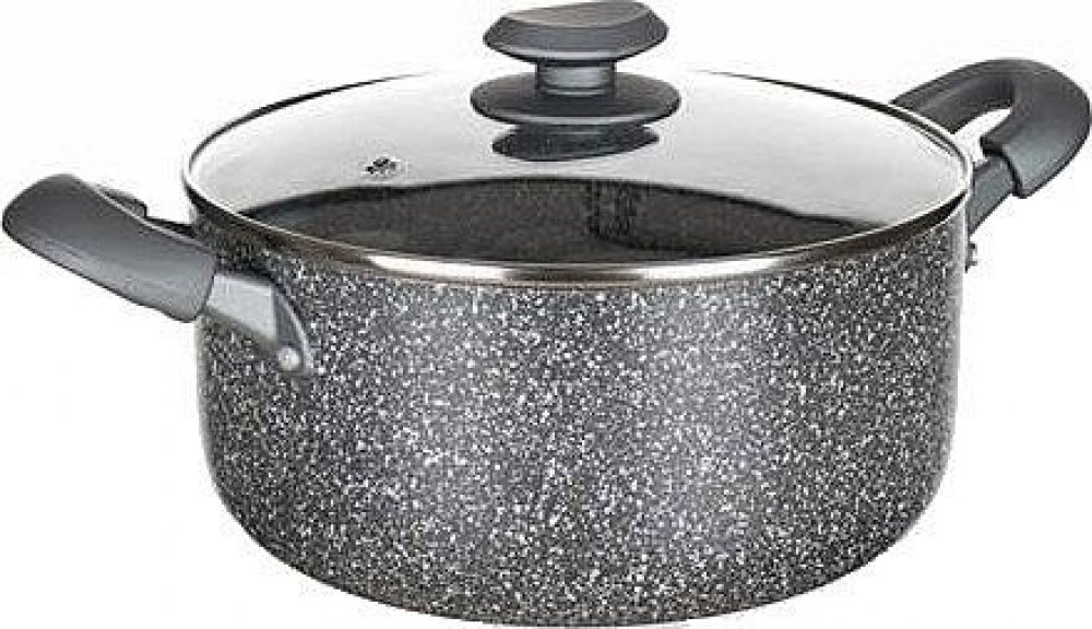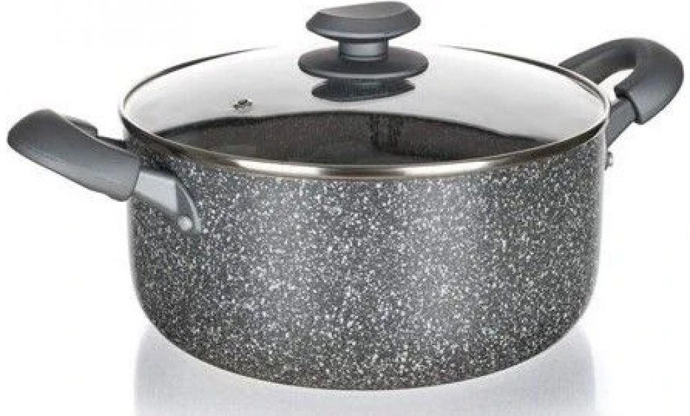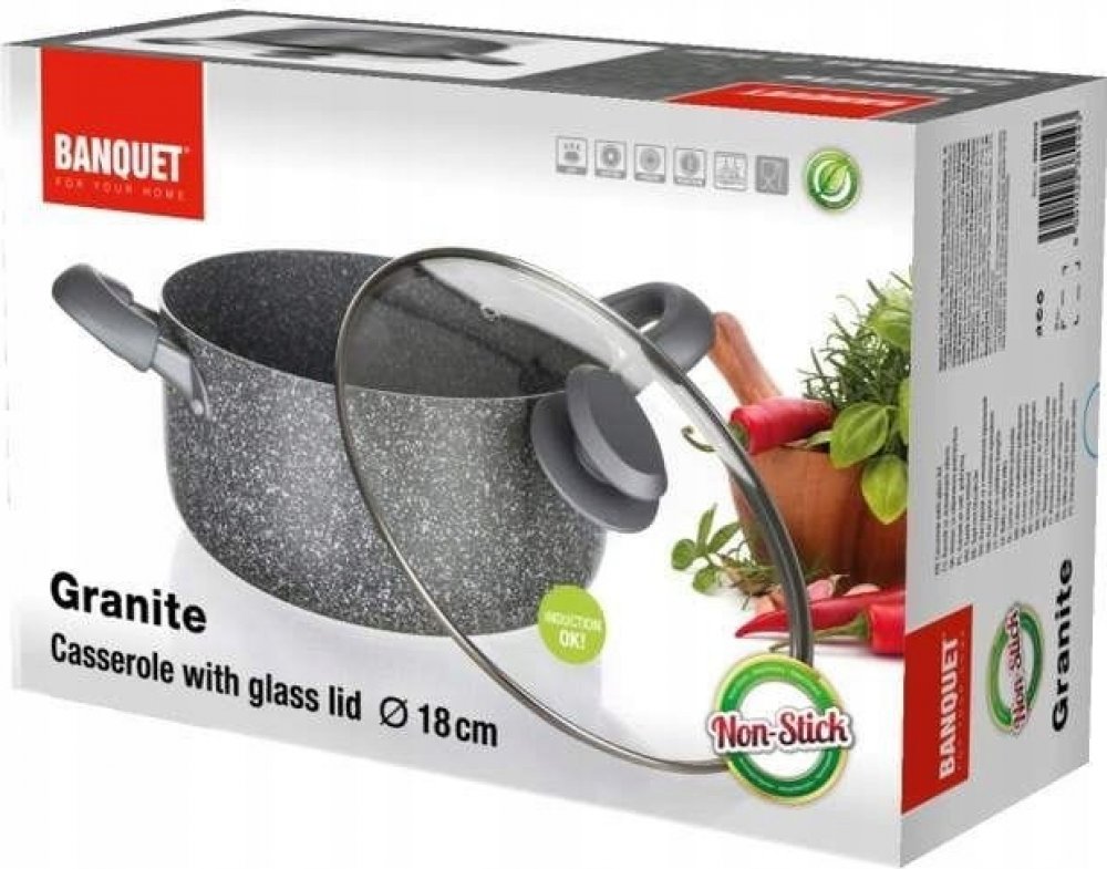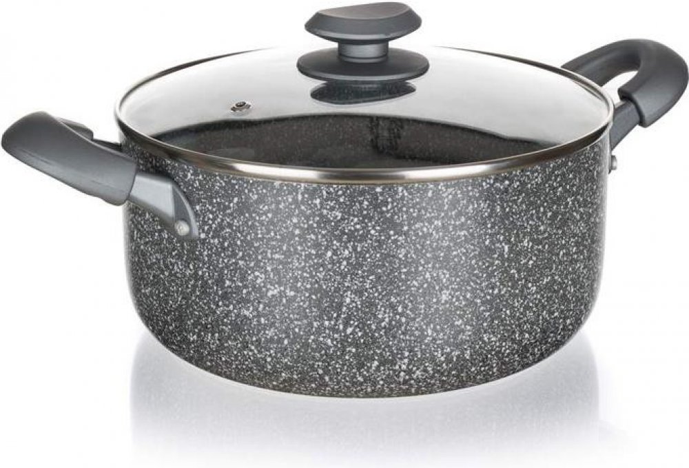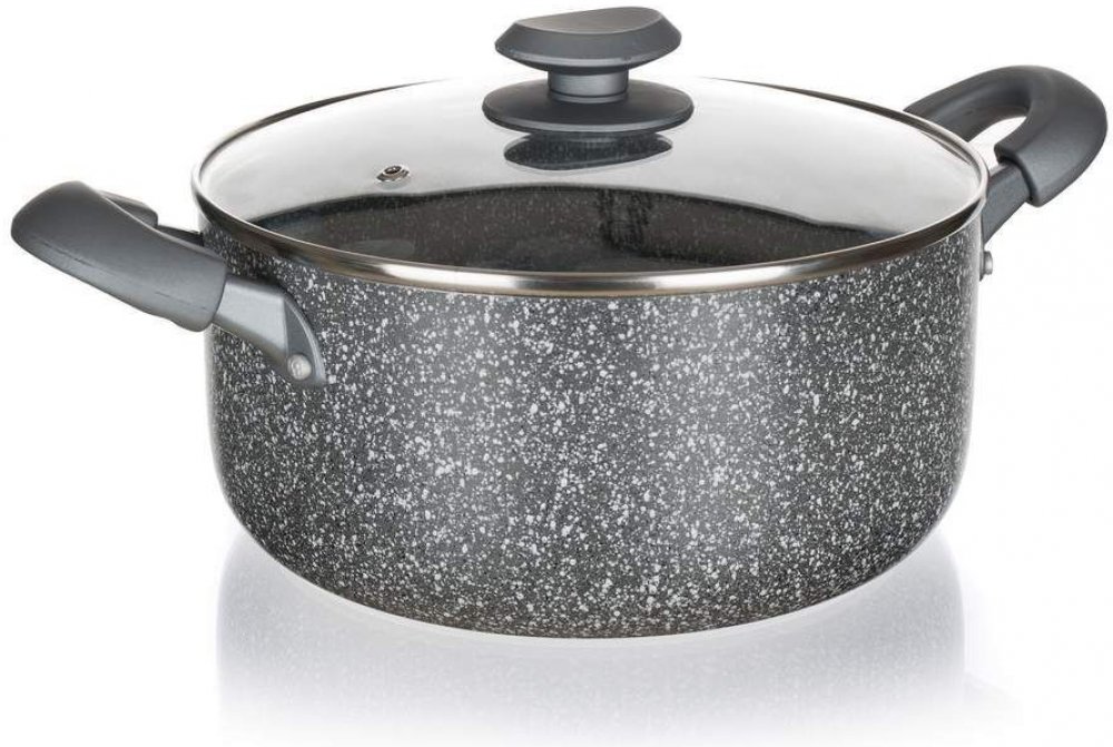 Hliníkový presovaný kastrol GRANITE 18 x 8,5 cm s nepřilnavým 2vrstvým povrchem v granitovém dekoru, s šedými silikonovými úchyty, skleněnou poklicí s šedým silikonovým knobem a plně indukčním dnem.