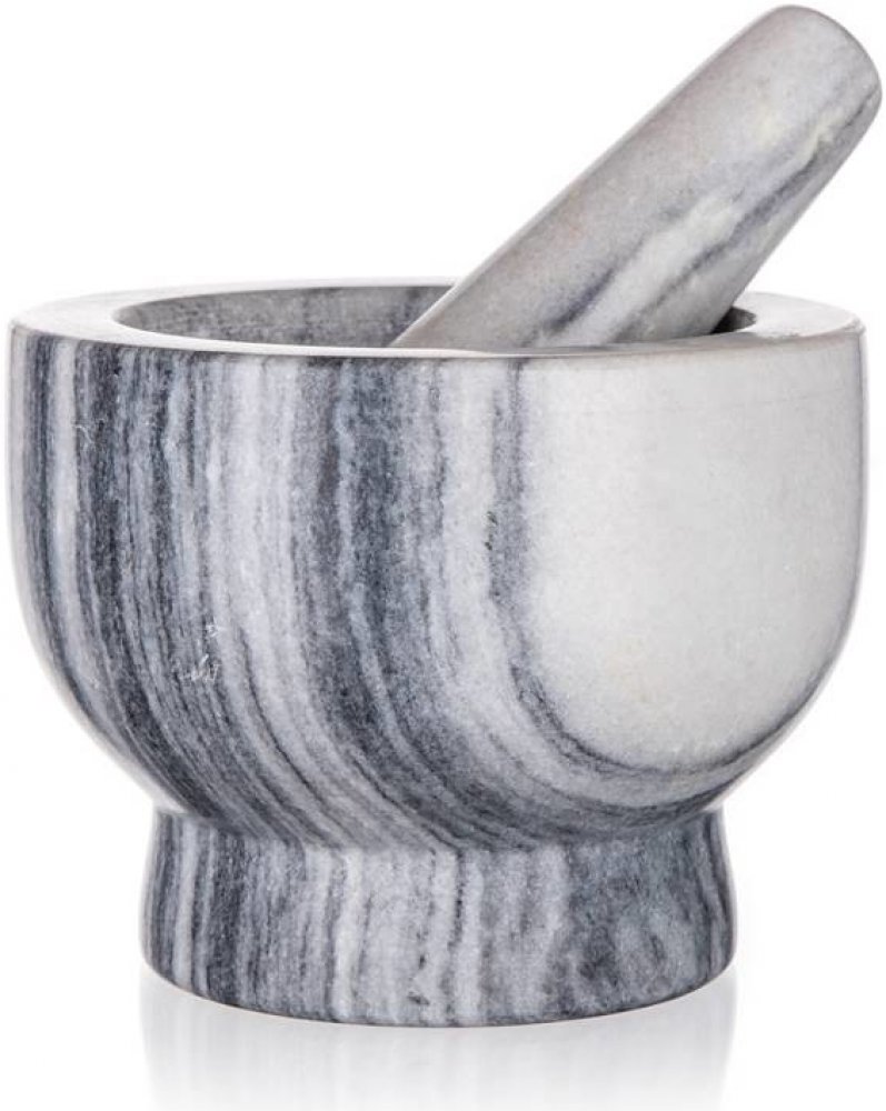 Hmoždíř mramorový CULINARIA s tloučkem pro klasické drcení koření, bylinek a výrobu domácího pesta. Hmoždíř si najde své místo v každé kuchyni jako užitečný pomocník i ozdoba. TIP: Je dobré nakupovat celé koření, jelikož mleté koření časem ztrácí chuť a vůni. Proto je dobré si potřebné množství vždy čerstvě rozmělnit například v hmoždíři. Délka tloučku je 13,7 cm.