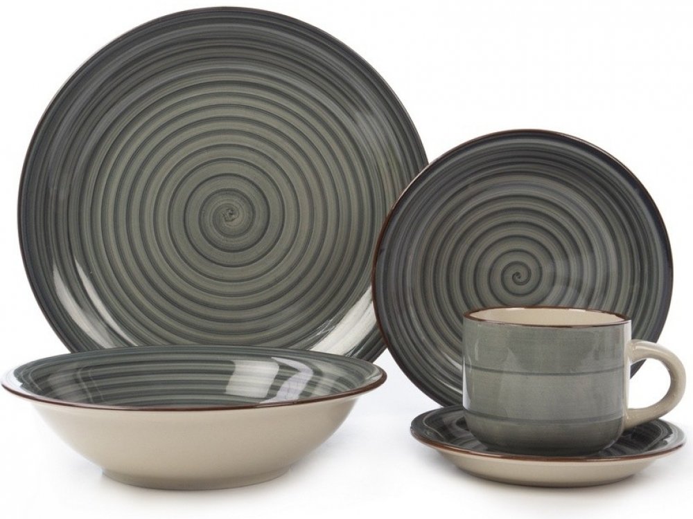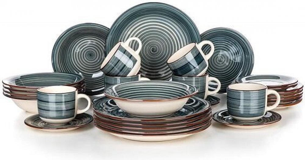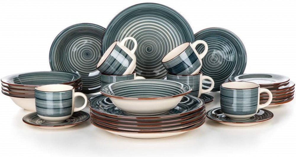 Elegantní jídelní sada v jemné pastelové barvě s dekorem spirály ozvláštní a krásně doplní váš jídelní stůl při každodenním stolování i svátečních událostech. Upozornění: nemýt v myčce nádobí na intenzivní program.Obsah sady:
