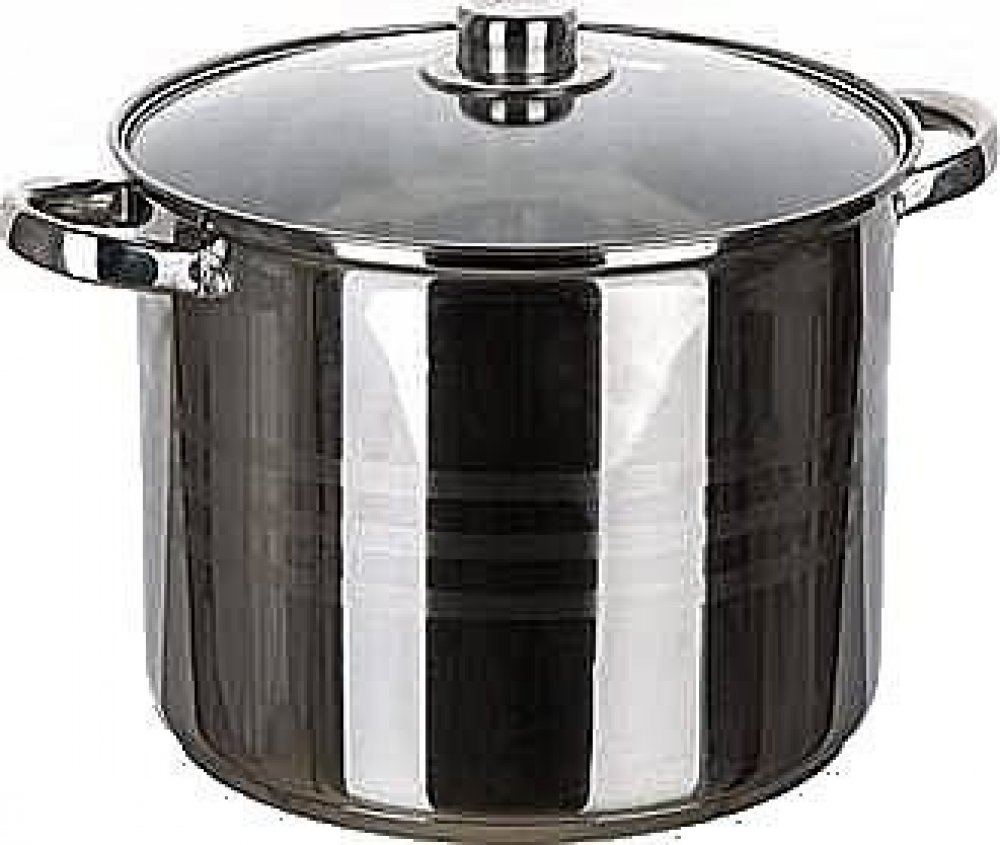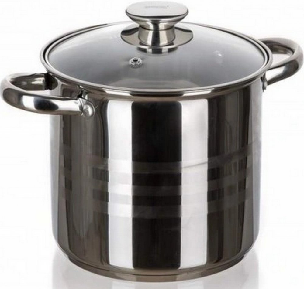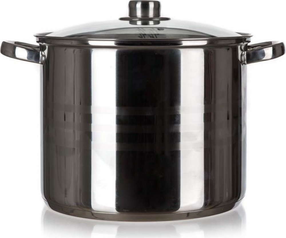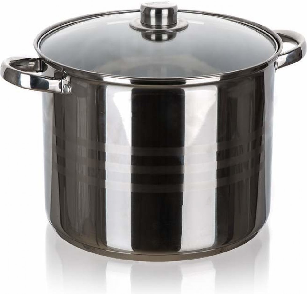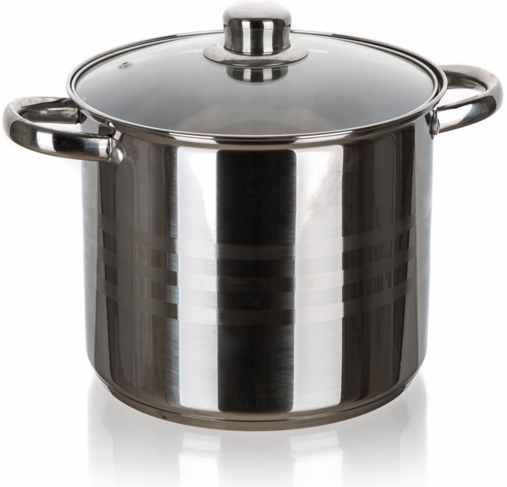 Nerezový hrnec LIVING 11,1 l, skleněná poklice, nerezový knob i držadla, lesklý povrch uvnitř i vně, vnější strana má tři matné pruhy. Hrnec lze použít na všechny typy varných desek včetně indukce.