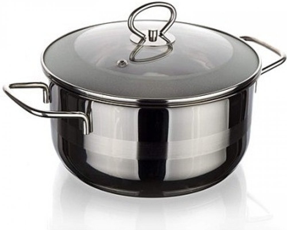 Nerezový kastrol se sklokeramickou poklicí a nerezovými držadly.