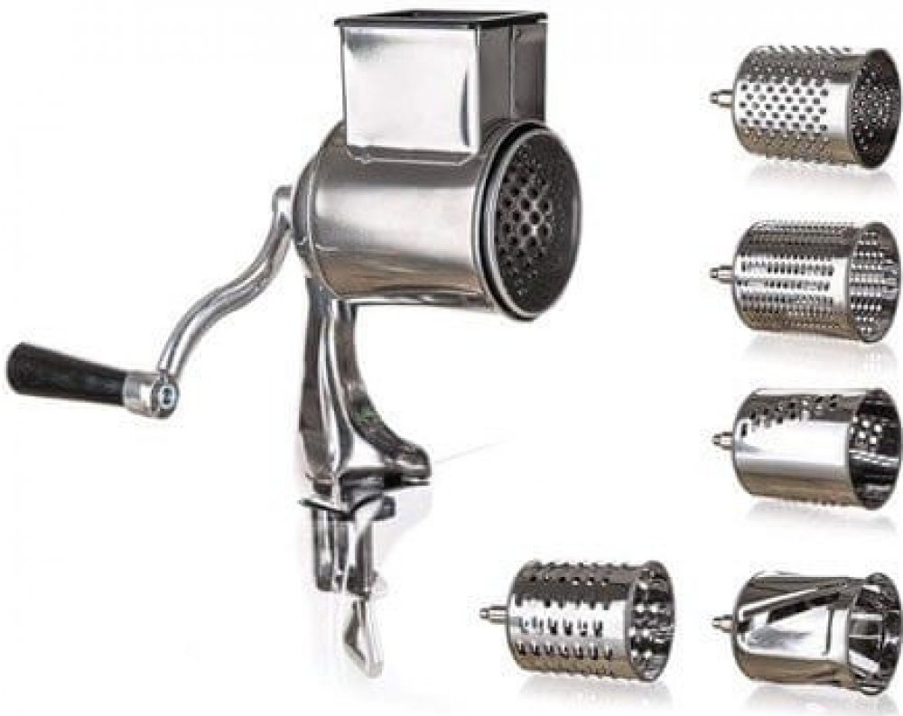 Univerzální nerezový mlýnek je vhodný na strouhání ořechů, čokolády, zeleniny, ovoce a plátkování tvrdých sýrů.