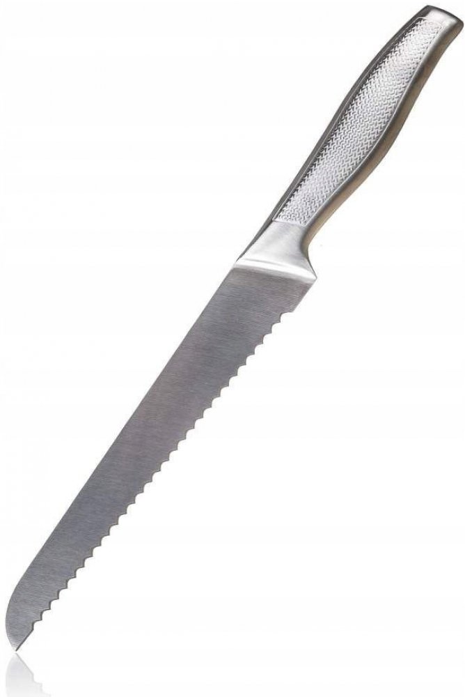 Nůž z řady Metallic je vyroben z vysoce kvalitní nerezové oceli. Má zoubky, díky kterým skvěle krájí pečivo – rohlíky, chléb nebo koláče. Je proto nenahraditelný v každé kuchyni. Nůž je praktický a pohodlný na používání.