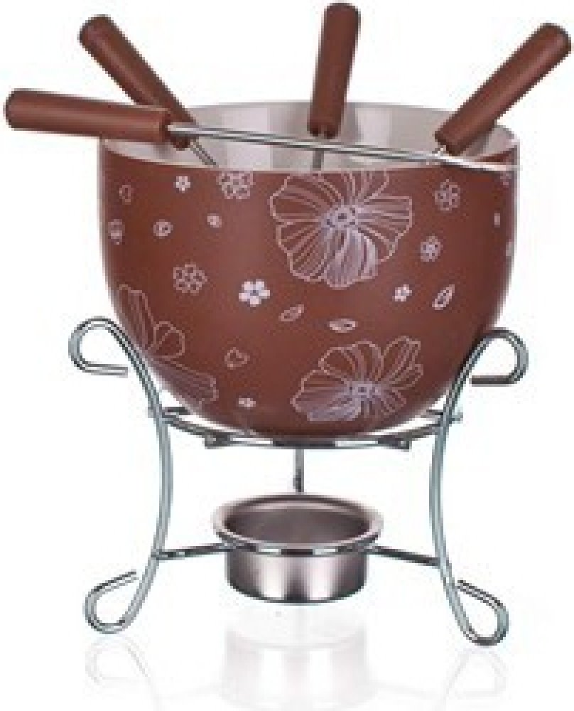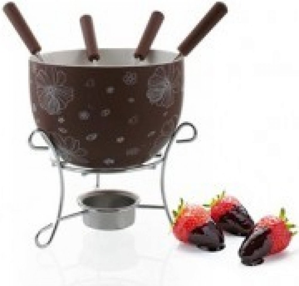 6dílný fondue set na čokoládu CHOCO BLOSSOMS: 1x keramická miska průměr 11,5 cm, výška 7,5 cm, 1x stojánek s držákem pro čajovou svíčku - výška 8 cm, 4x vidlička - délka 15 cm, materiál nerez + PP.
