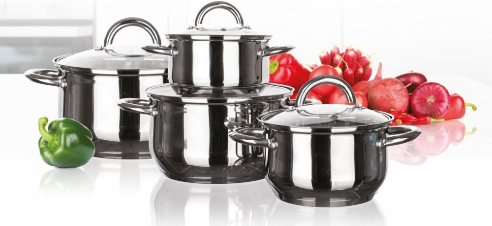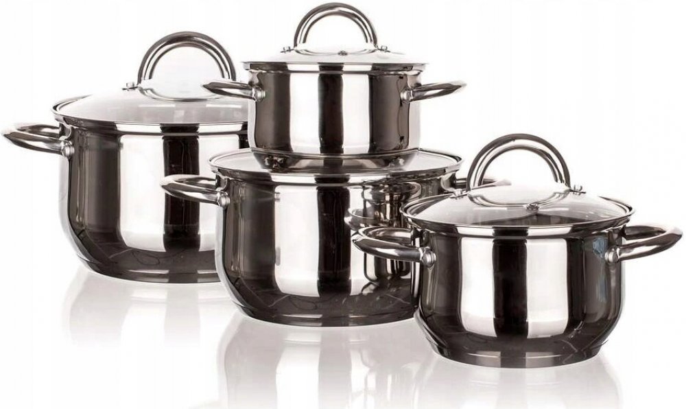 8dílná sada nerezového nádobí MODENA, sada obsahuje: hrnec s poklicí 14 x 9,5 cm, hrnec s poklicí 16 x 10,5 cm, hrnec s poklicí 18 x 11,5 cm, hrnec s poklicí 20 x 12,5 cm. Povrchová úprava hrnců - lesk (uvnitř i vně), na vnitřní straně měrky objemu, skleněné poklice. Držadla a knoby jsou nerezové, držadla jsou přichycena šrouby. Hrnce lze používat na všechny typy varných desek včetně indukce.