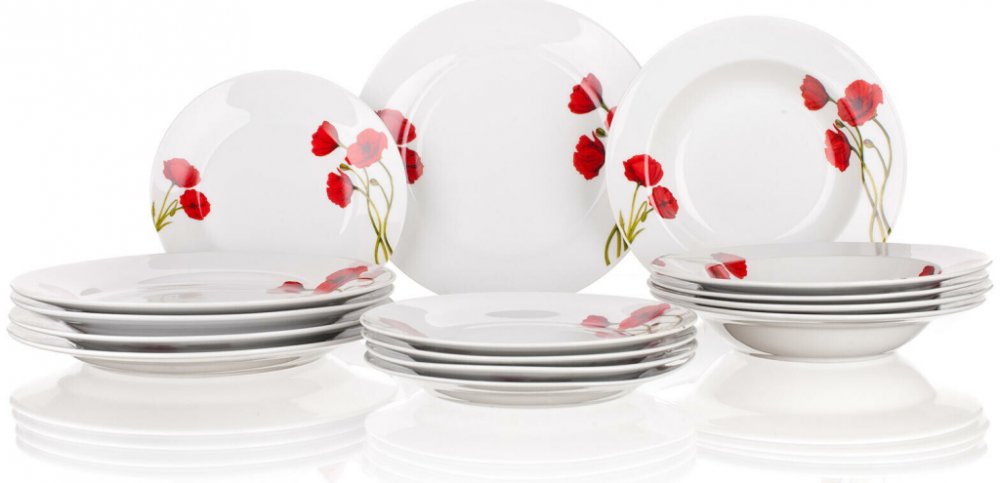 Osmnáctidílná talířová sada Banquet Poppy obsahuje 6 porcelánových dezertních talířků s dekorem vlčího máku, 6 hlubokých talířů a 6 mělkých talířů v totožném dekoru. Celou sadu využijete pro servírování celého obědového menu. Nádobí je vhodné pro běžné domácí užití, lze je mýt v myčce a je možné je používat i do mikrovlnné trouby. Osmnáctidílná talířová sada Banquet Poppy obsahuje 6 porcelánových ...