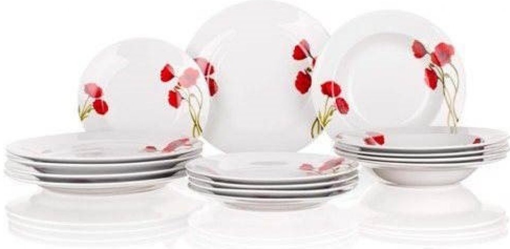 Osmnáctidílná talířová sada Banquet Poppy obsahuje 6 porcelánových dezertních talířků s dekorem vlčího máku, 6 hlubokých talířů a 6 mělkých talířů v totožném dekoru. Celou sadu využijete pro servírování celého obědového menu. Nádobí je vhodné pro běžné domácí užití, lze je mýt v myčce a je možné je používat i do mikrovlnné trouby. Osmnáctidílná talířová sada Banquet Poppy obsahuje 6 porcelánových dezertních talířků s dekorem vlčího máku, 6 hlubokých talířů a 6 mělkých talířů v totožném dekoru. Celou sadu využijete pro servírování celého obědového menu. Nádobí je vhodné pro běžné domácí užití, lze je mýt v myčce a je možné jej používat i do mikrovlnné trouby. Klíčové vlastnosti Osmnáctidílná sada bílého nádobí s dekorem vlčího máku Na výrobu byl použit kvalitní porcelán Průměr dezertních talířků: 19 cm Průměr hlubokých talířků: 21,5 cm Průměr mělkých talířů: 24 cm Nádobí lze mýt myčce a lze je používat v mikrovlnné troubě
