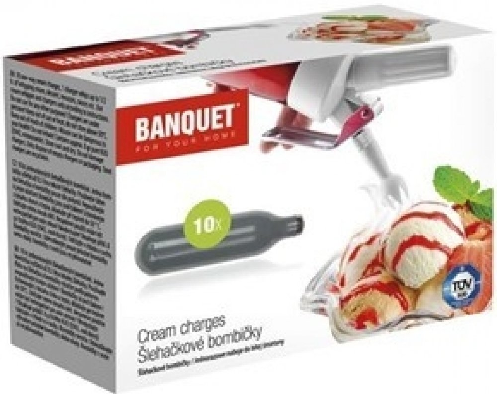 Šlehačkové bombičky plněné oxidem dusným - jednorázové, váha náplně 8 gr, 10 ks v balení. Bombička je naplněna kapalným potravinářským N2O, tzv. rajským plynem. Plyn se používá jako šlehací a hnací médium pro výrobu šlehačky ve šlehačkových lahvích.